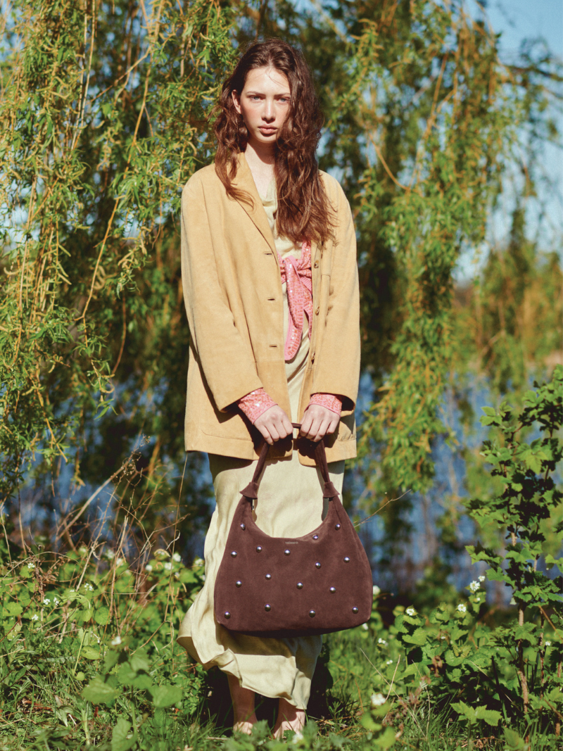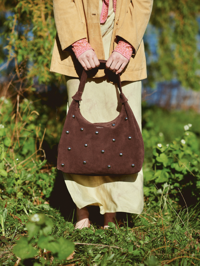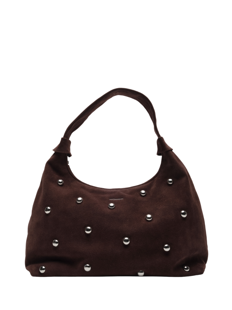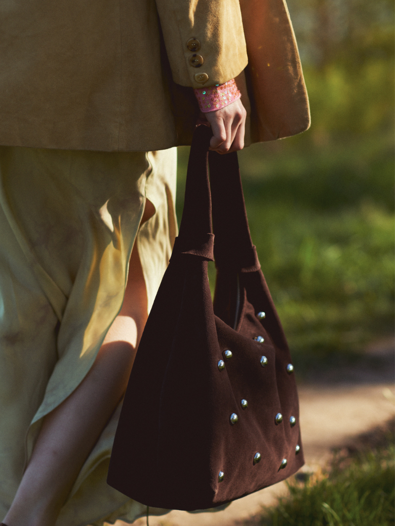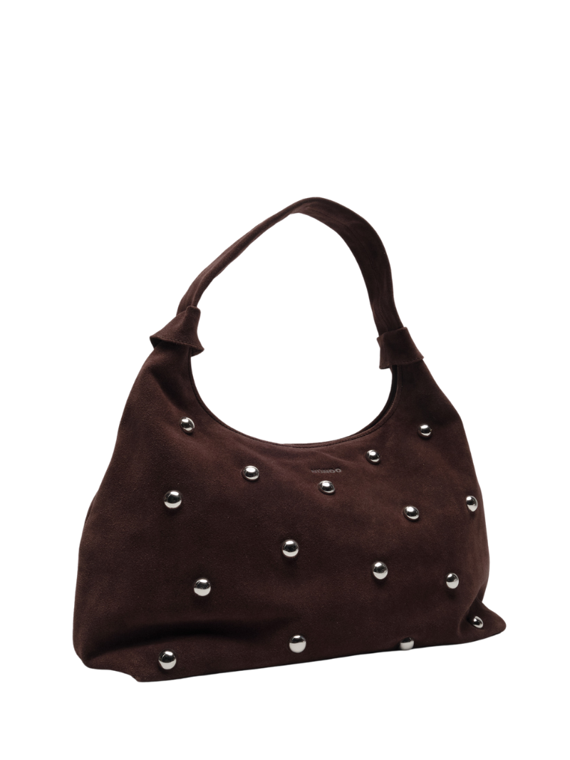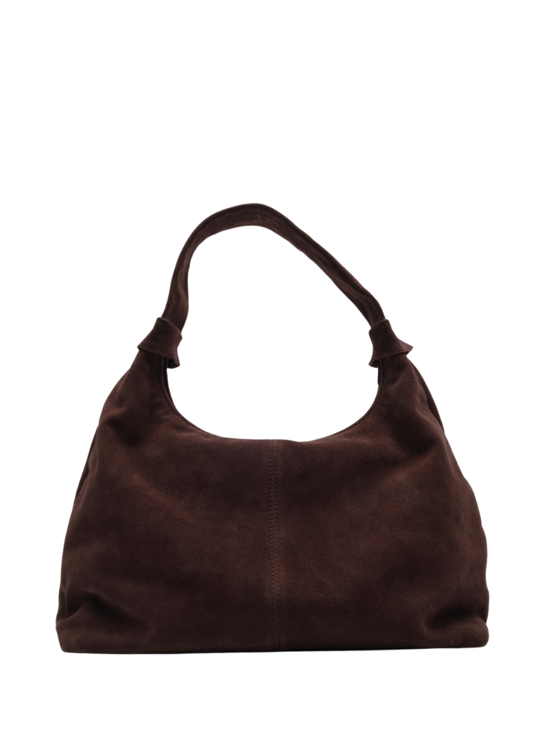 Bolso grande de hombro confeccionado en ante suave de color marrón chocolate, con un acabado aterciopelado y cálido que aporta una textura sofisticada.