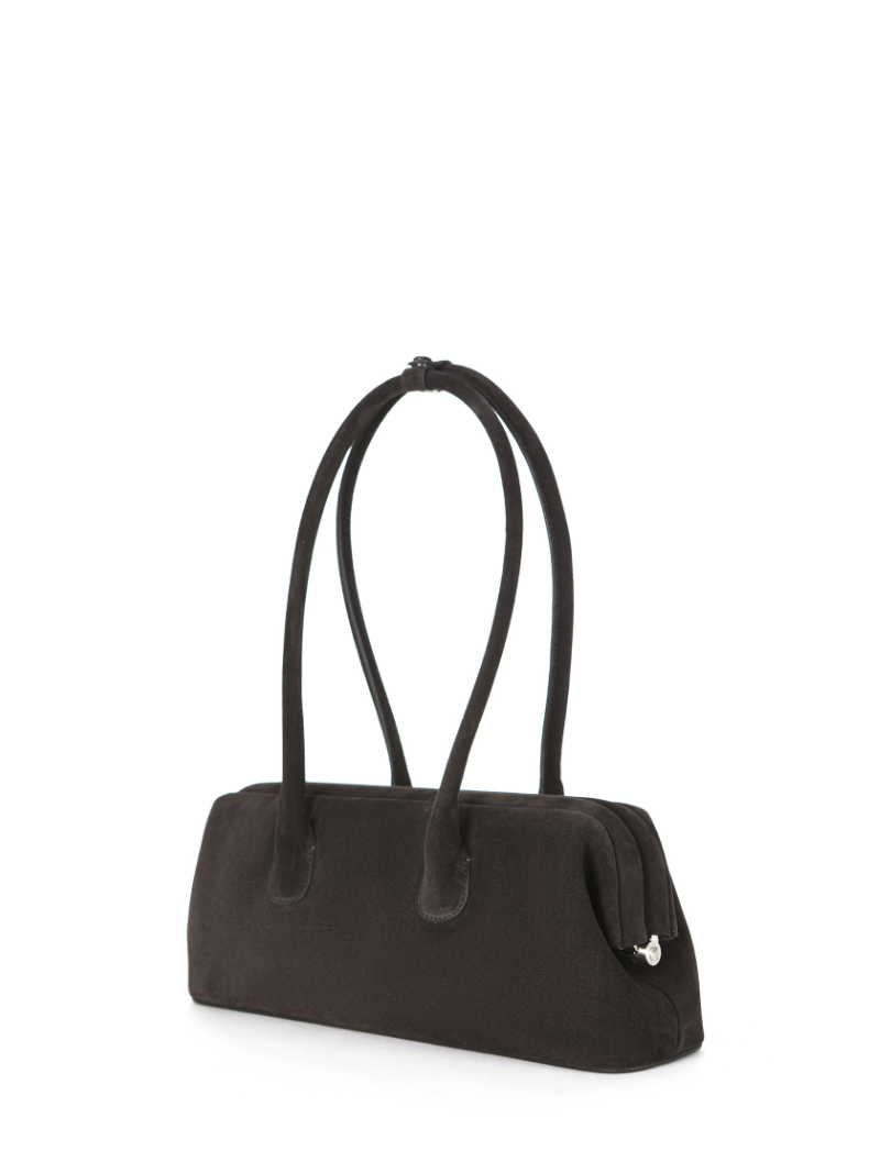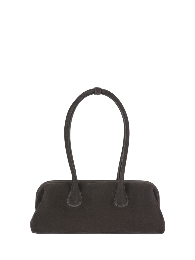 Bolso baguette de ante marrón, fabricado con materiales de alta calidad. Su diseño único y su amplio espacio interior lo convierten en el accesorio perfecto para quienes buscan funcionalidad y estilo.