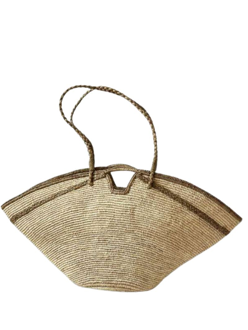 Bolso mediano de rafia, tejido a mano en Madagascar. Su diseño amplio y ligero lo convierte en el aliado perfecto para los días de verano.
