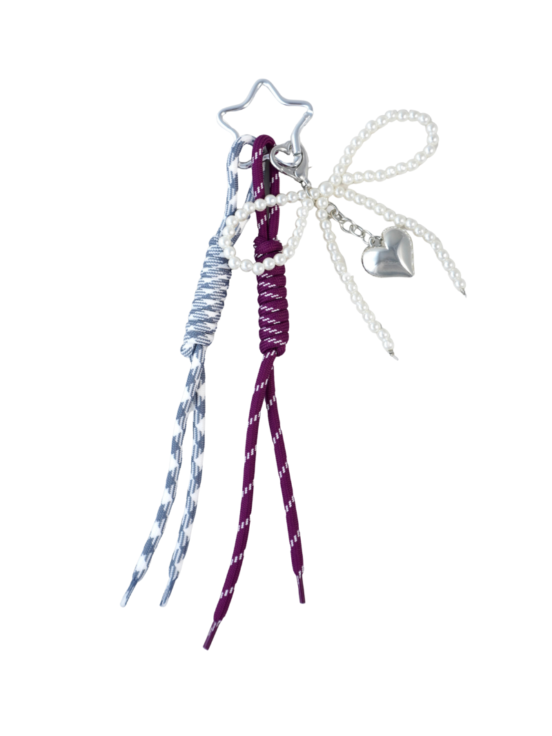 Charm con cordones trenzados en tonos lila, azul y blanco, un corazón metálico y un lazo de perlas que le da ese toque final de elegancia, es el accesorio ideal para elevar cualquier bolso sin hacer ruido. Sutil, pero inolvidable.