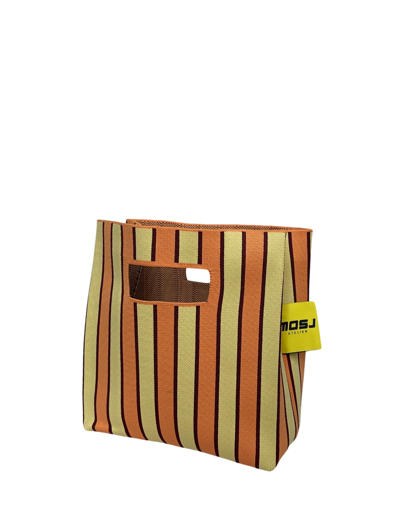 Bolso de mano tipo bucket con un llamativo estampado de rayas en amarillo, naranja y burdeos. Diseñado para destacar, combina un estilo moderno con funcionalidad.