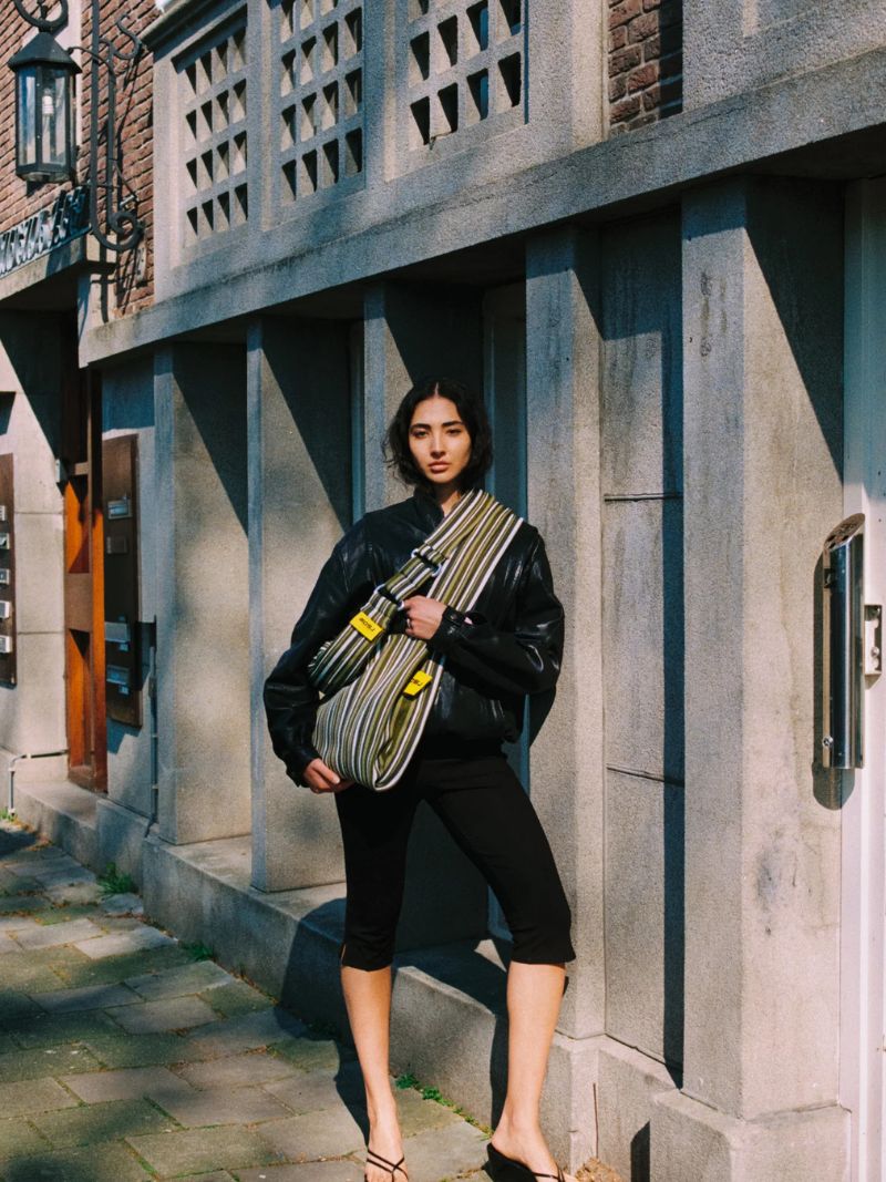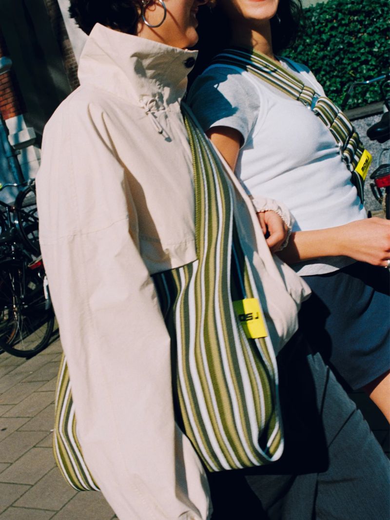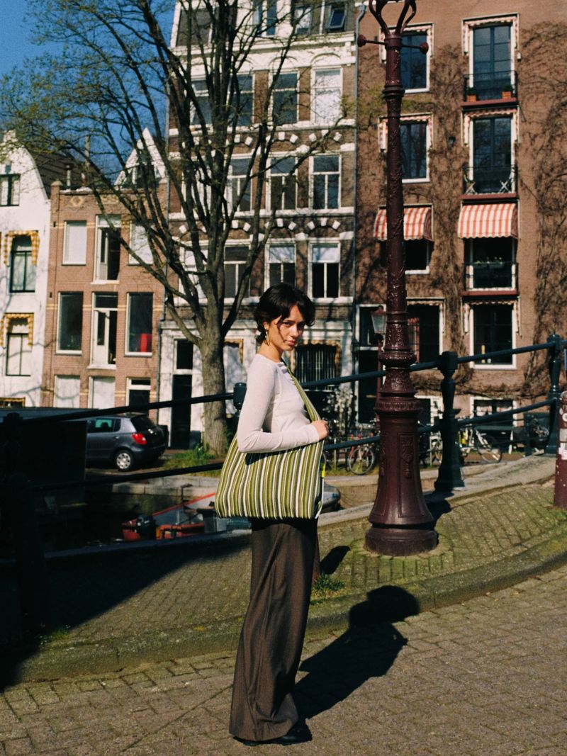 Bolso grande cruzado con estampado de rayas en tonos verdes. Fabricado en un material elástico, resistente y de gran durabilidad, este bolso es ligero, cómodo de llevar y fácil de lavar, ideal para el uso diario.
