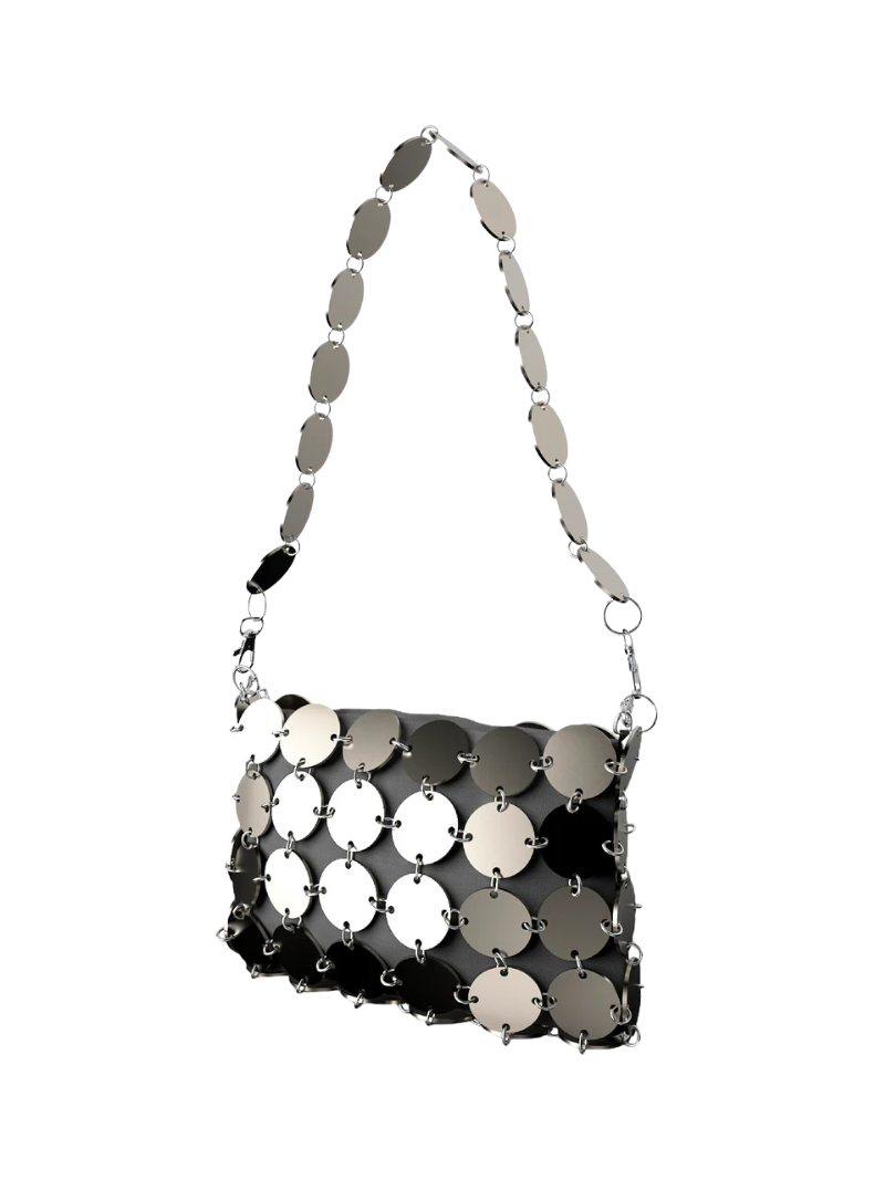 Bolso hecho a partir de chapas de acero. Contiene una funda gris. La carcasa es combinable con todas las fundas y asas de Mas1.
