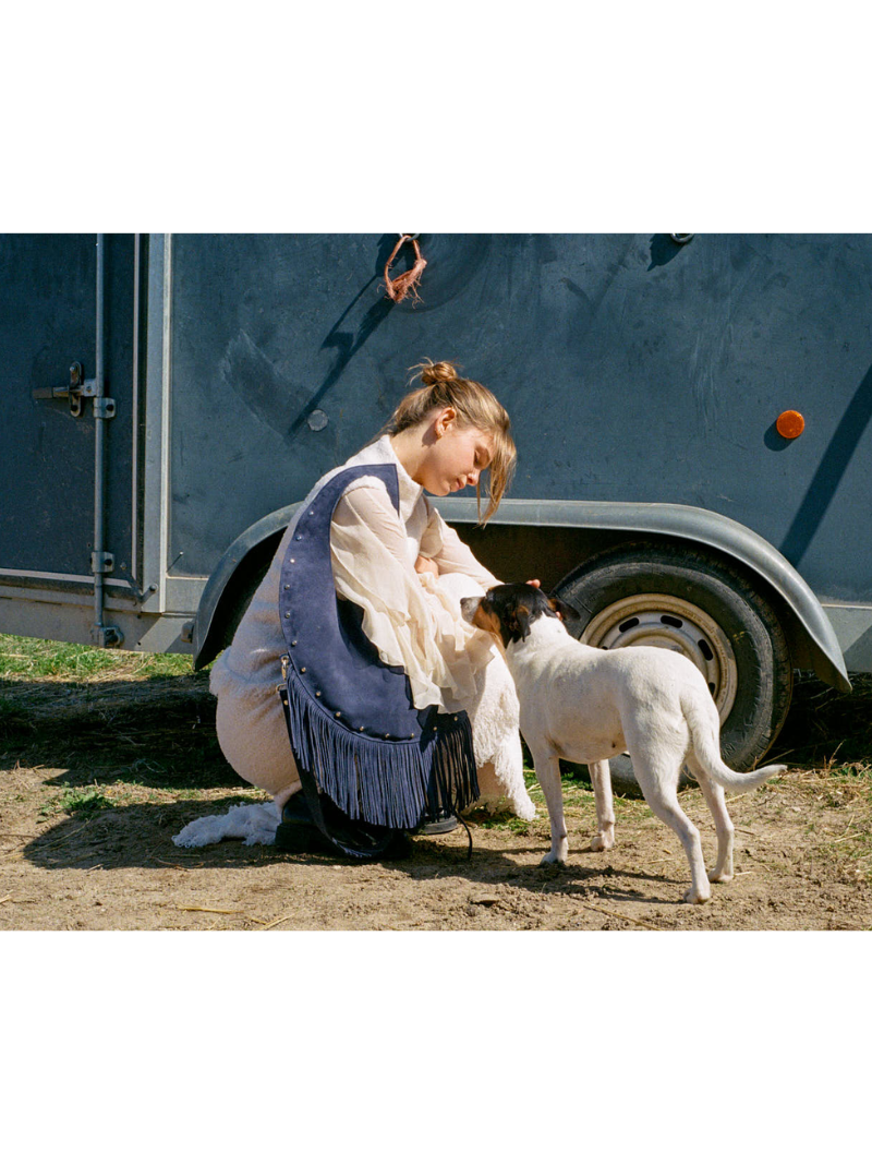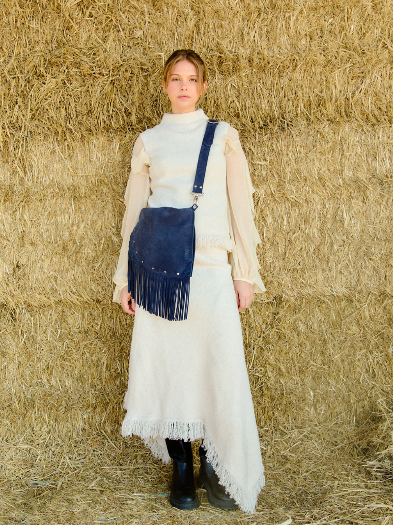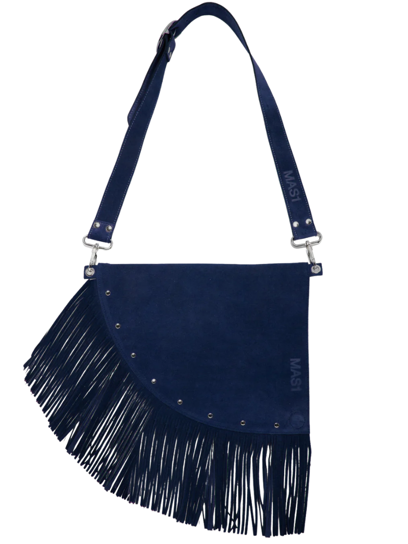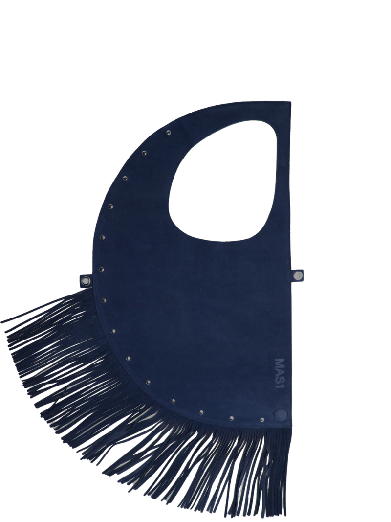 El bolso D Bag combina diseño y personalidad en una original forma de letra "D", confeccionado en ante de piel de vacuno color azul con certificación LWG (Leather Working Group), que avala un proceso de curtido responsable y sostenible.