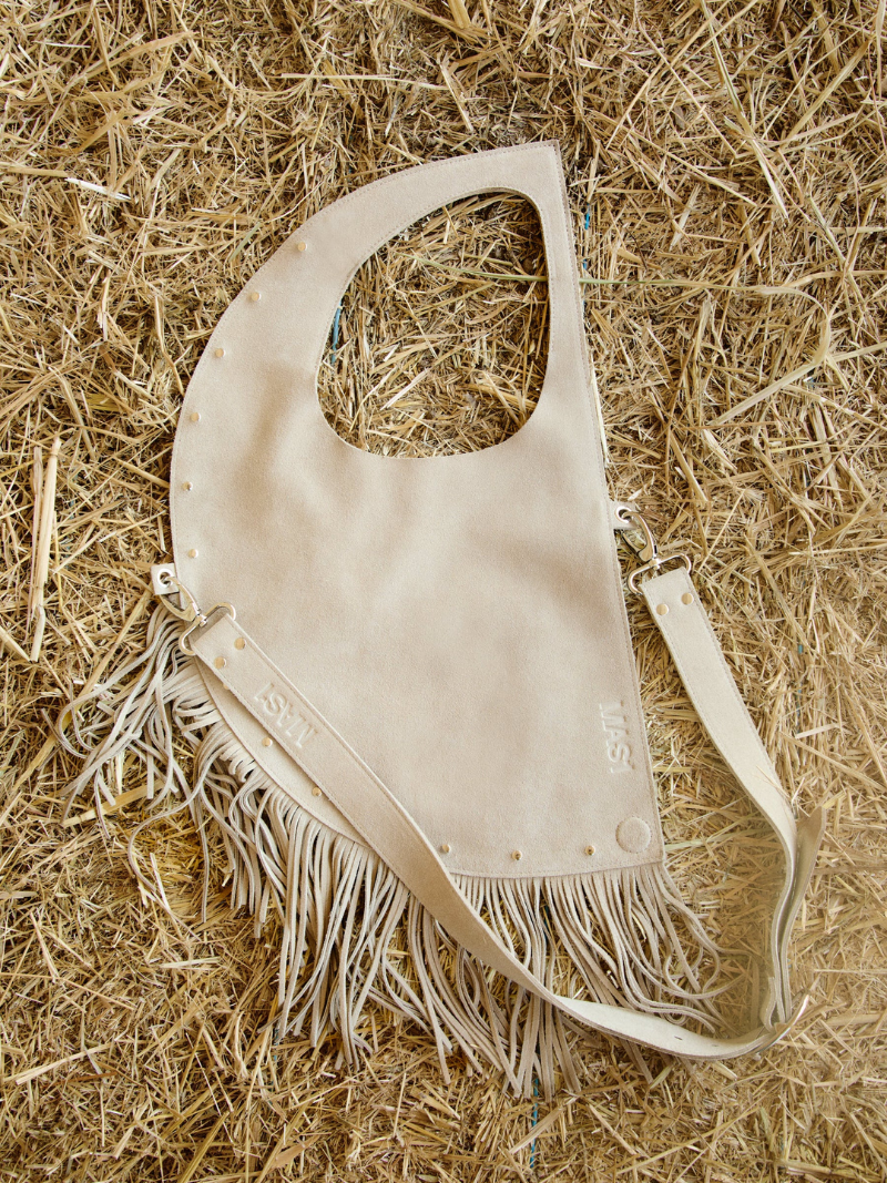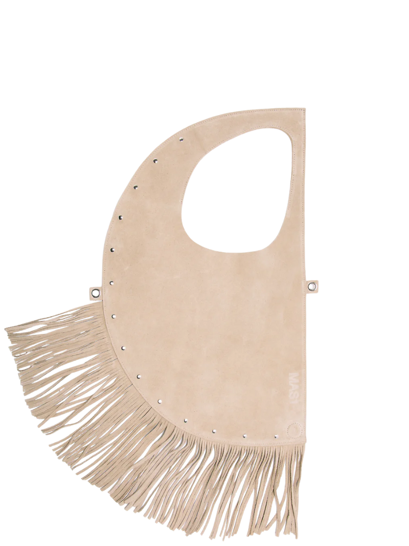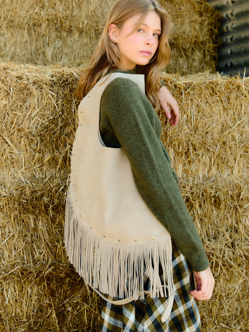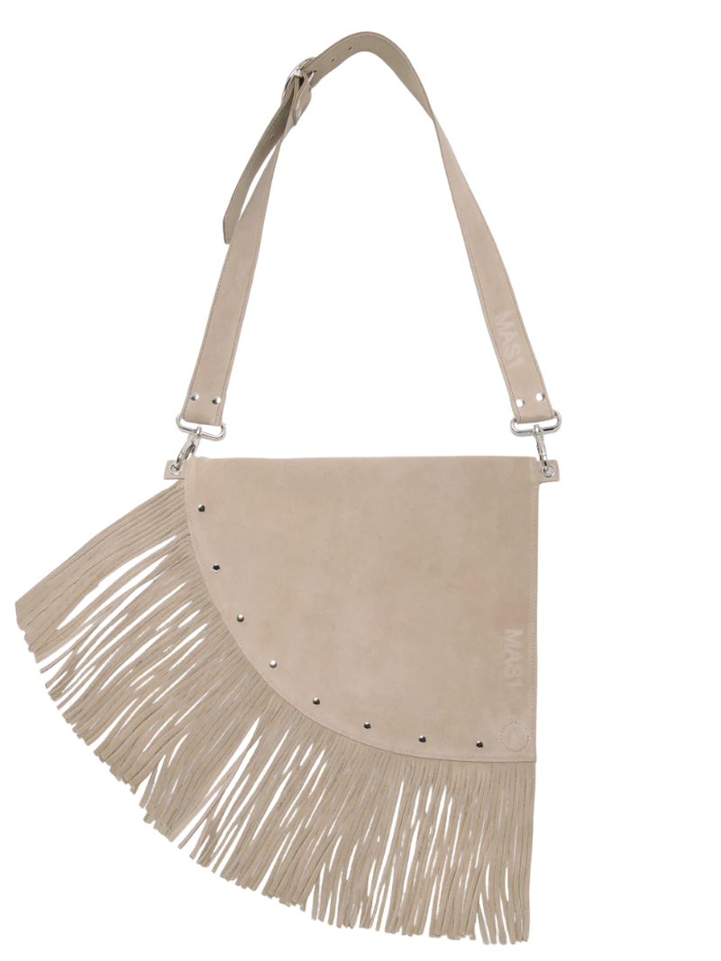 Con un marcado estilo boho chic, este bolso se adapta a tu ritmo gracias a sus dos asas: una corta para llevar al hombro y otra ajustable e intercambiable para usarlo como bandolera o shopper. El diseño incluye flecos largos, tachuelas metálicas decorativas y el logo estampado en el frontal, aportando movimiento, textura y un aire desenfadado y sofisticado.