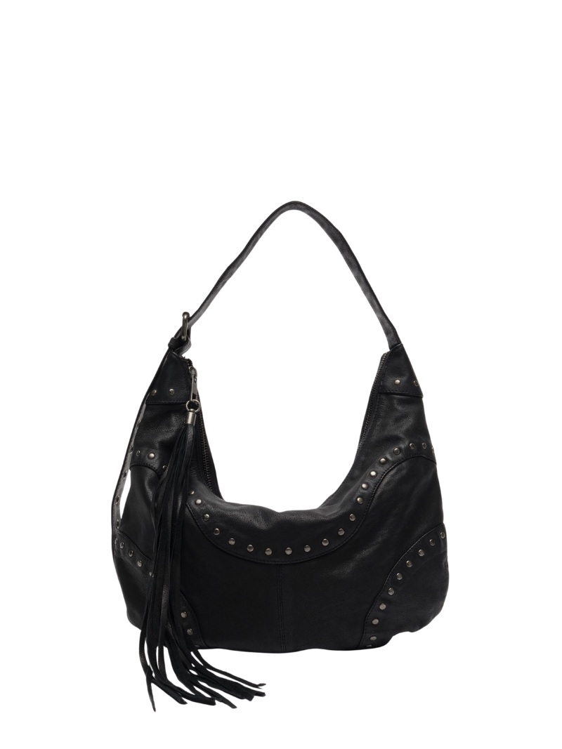 Bolso mediano de piel en color negro con forma redonda que se cierra con una pequeña hebilla. Tiene detalles flecos y una piel ultra suave.