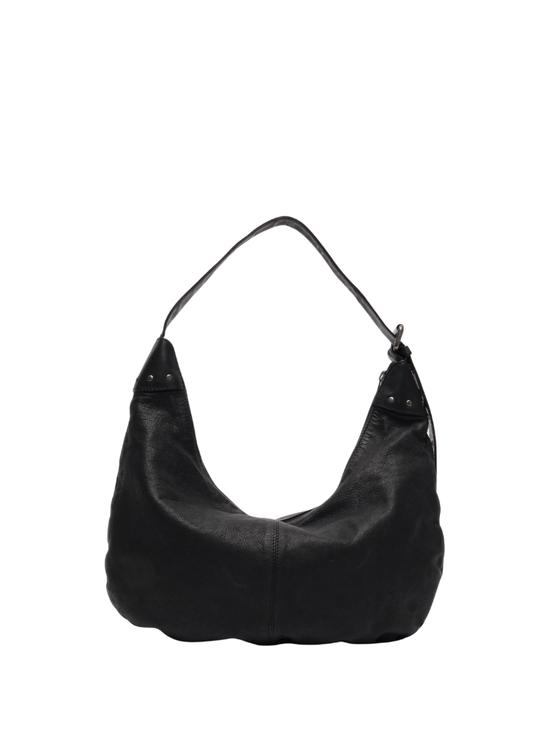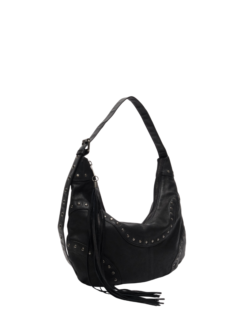 El bolso tiene una cadena extraíble que puede llevarse tanto en el hombro, cruzado o en la mano. Cierre con cremallera. Un bolso en tendencia por su forma medialuna, las hebillas, las tachuelas y la piel washed.