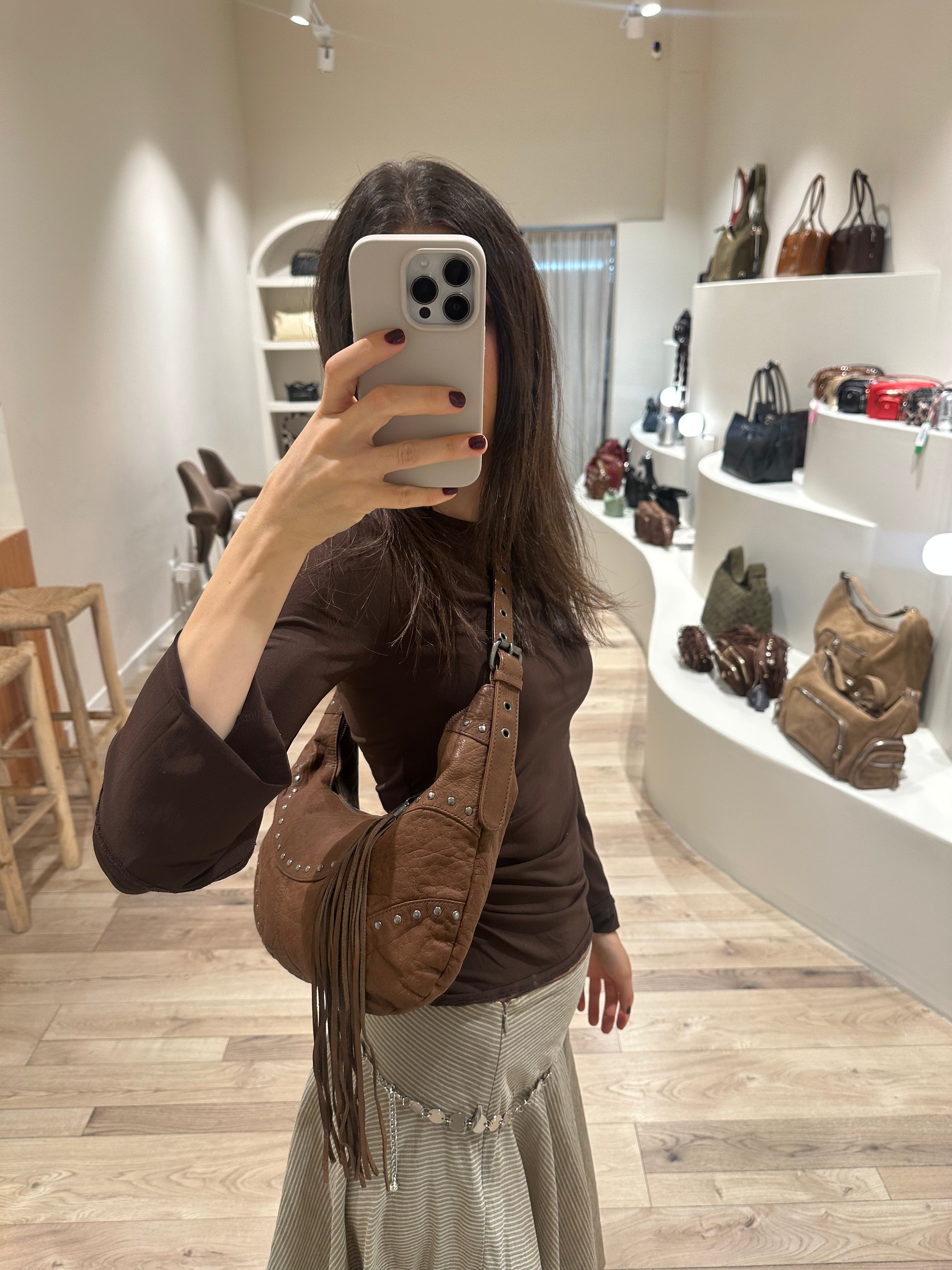 Bolso mediano de piel en color marrón con forma redonda que se cierra con una pequeña hebilla. Tiene detalles flecos y una piel ultra suave.
