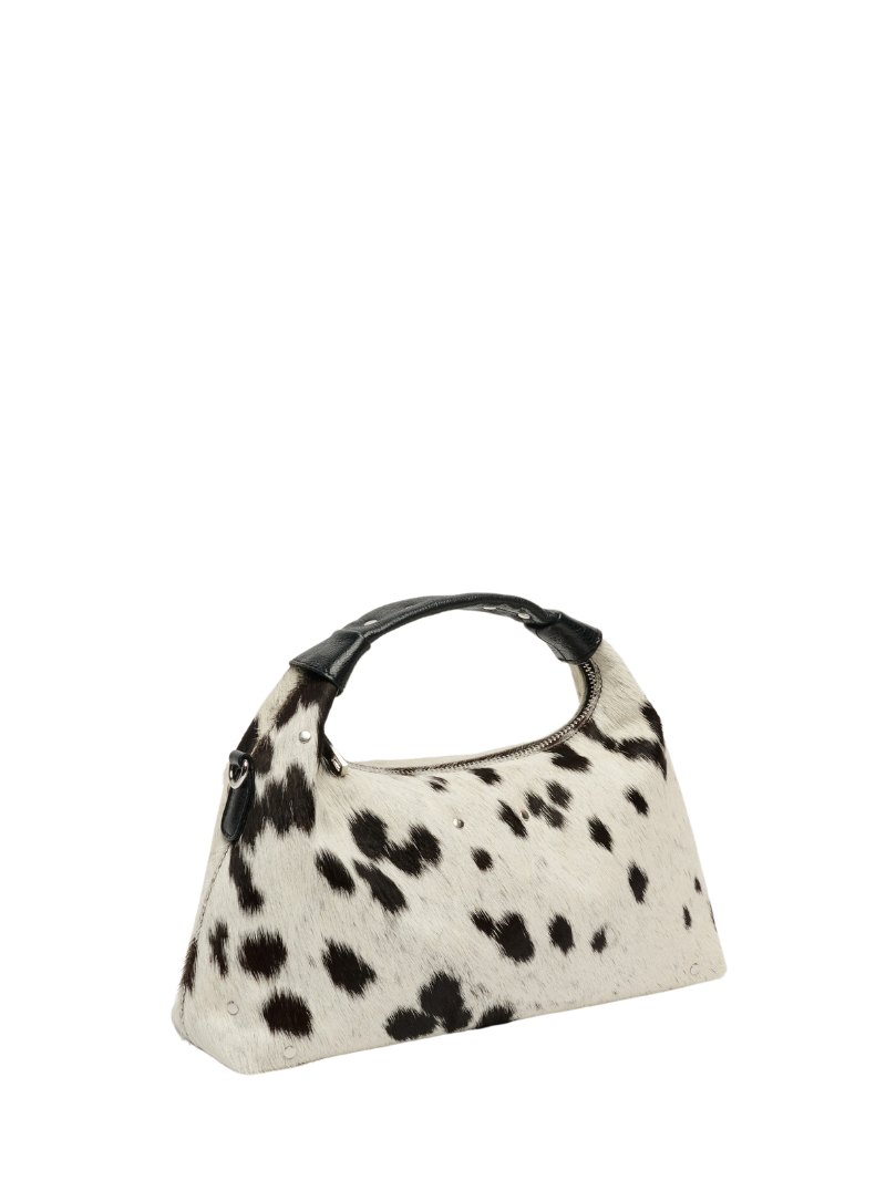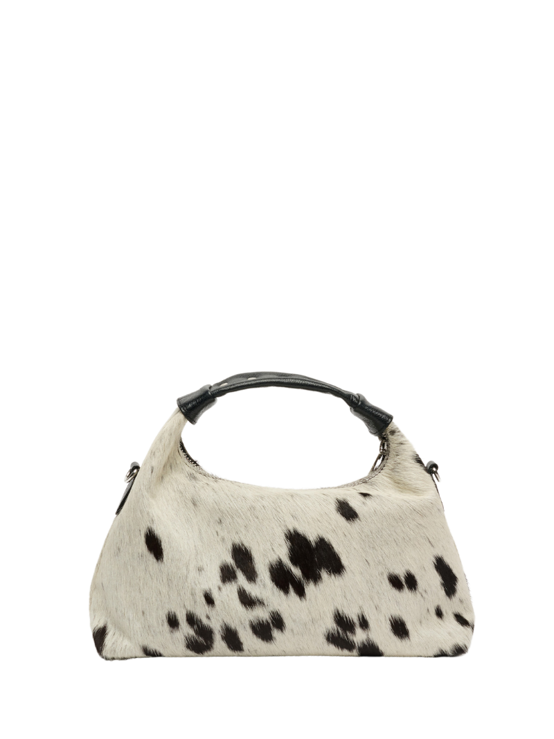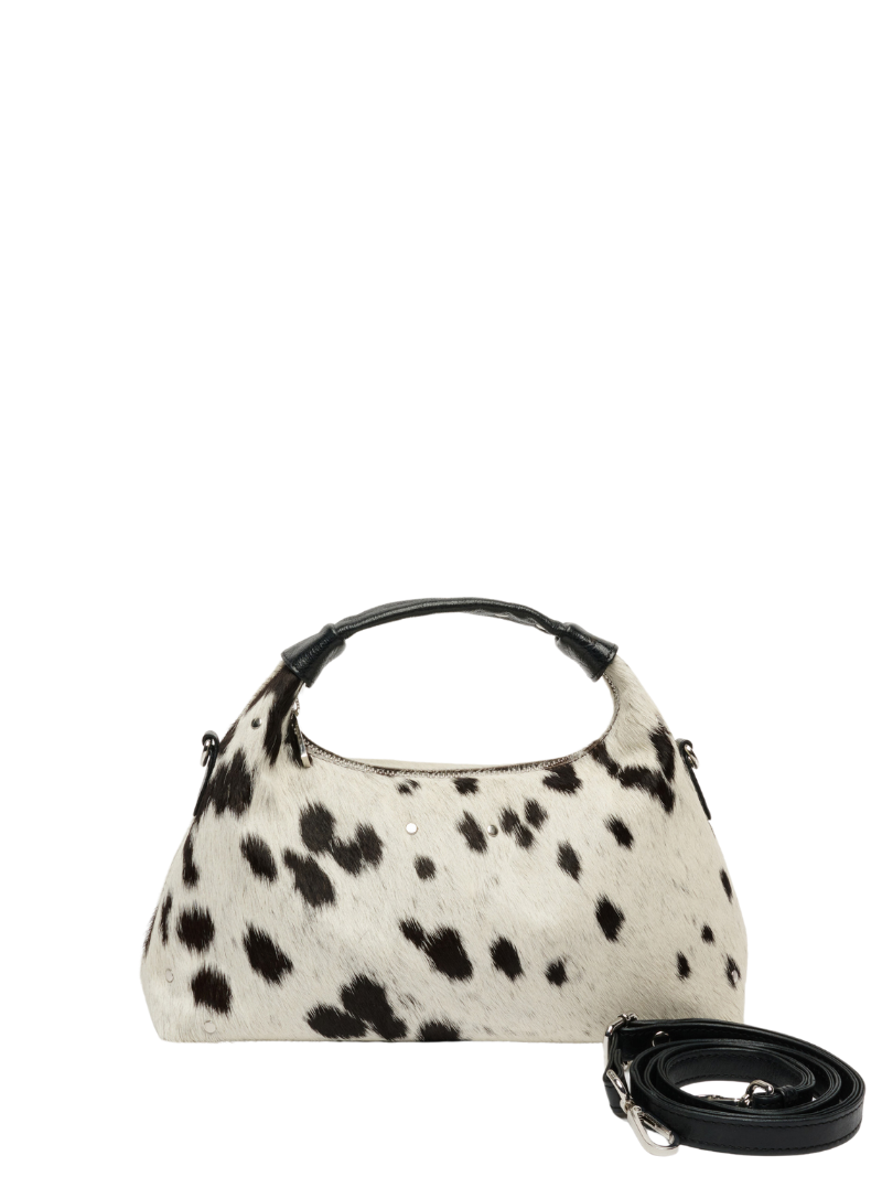Bolso de piel mediano con estampado de vaca en blanco y negro. Puede llevarse de mano gracias a su asa corta superior forrada en piel negra, o cruzado con la correa larga ajustable del mismo tono.