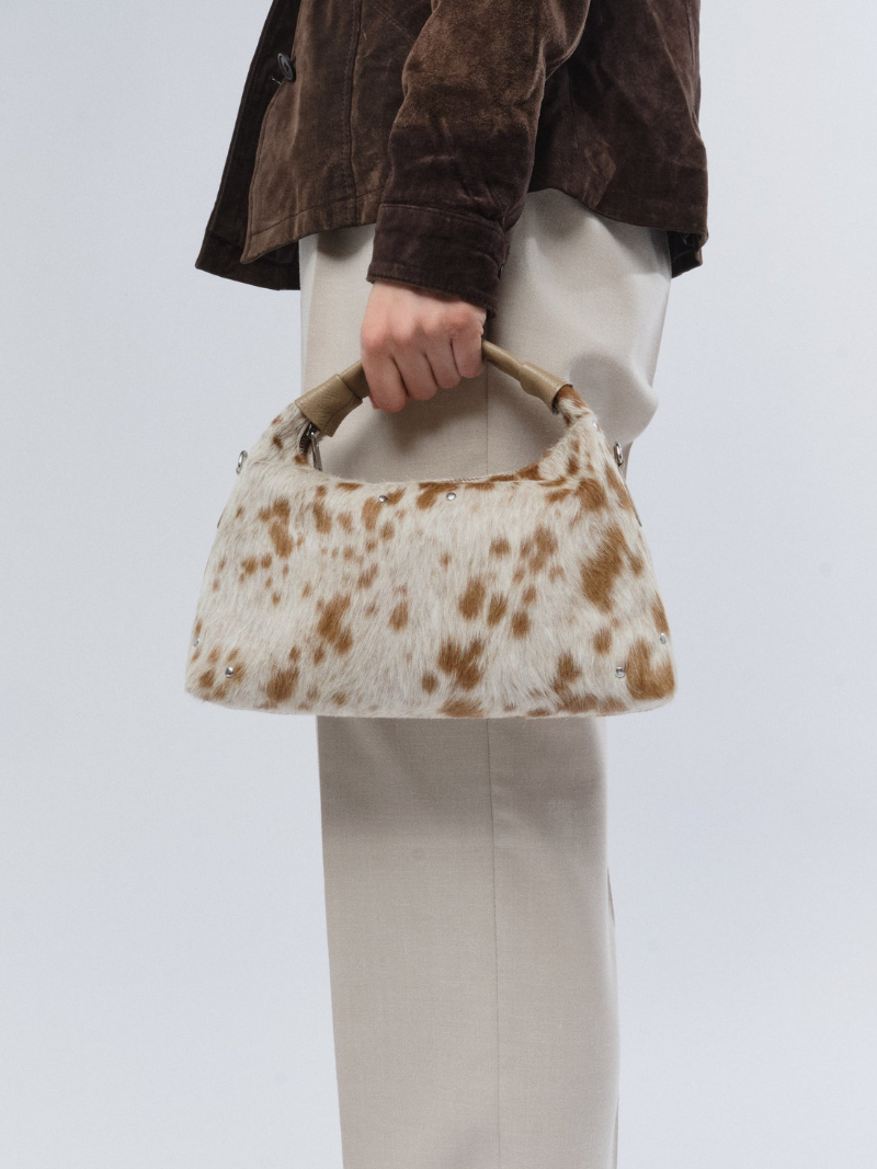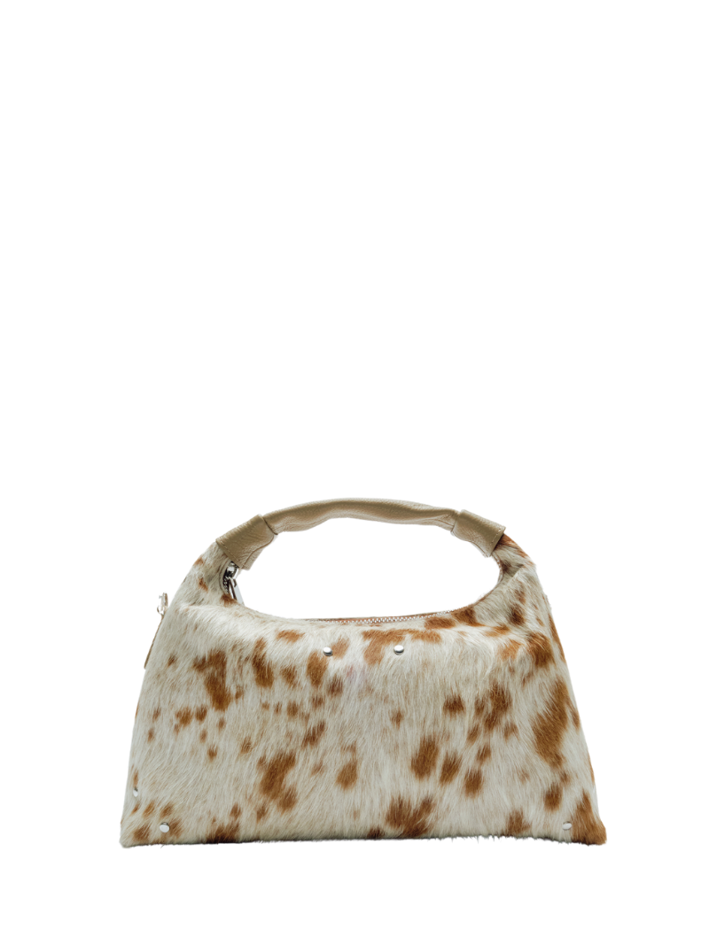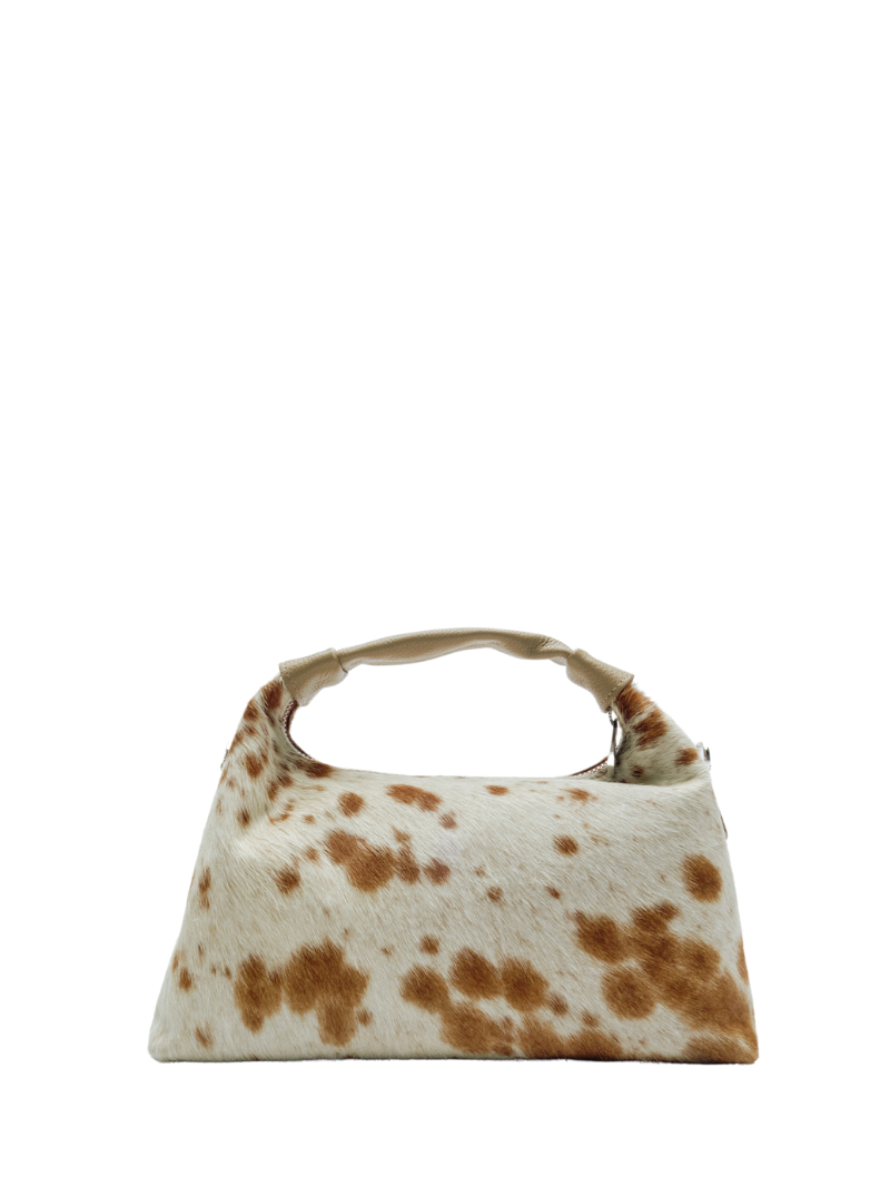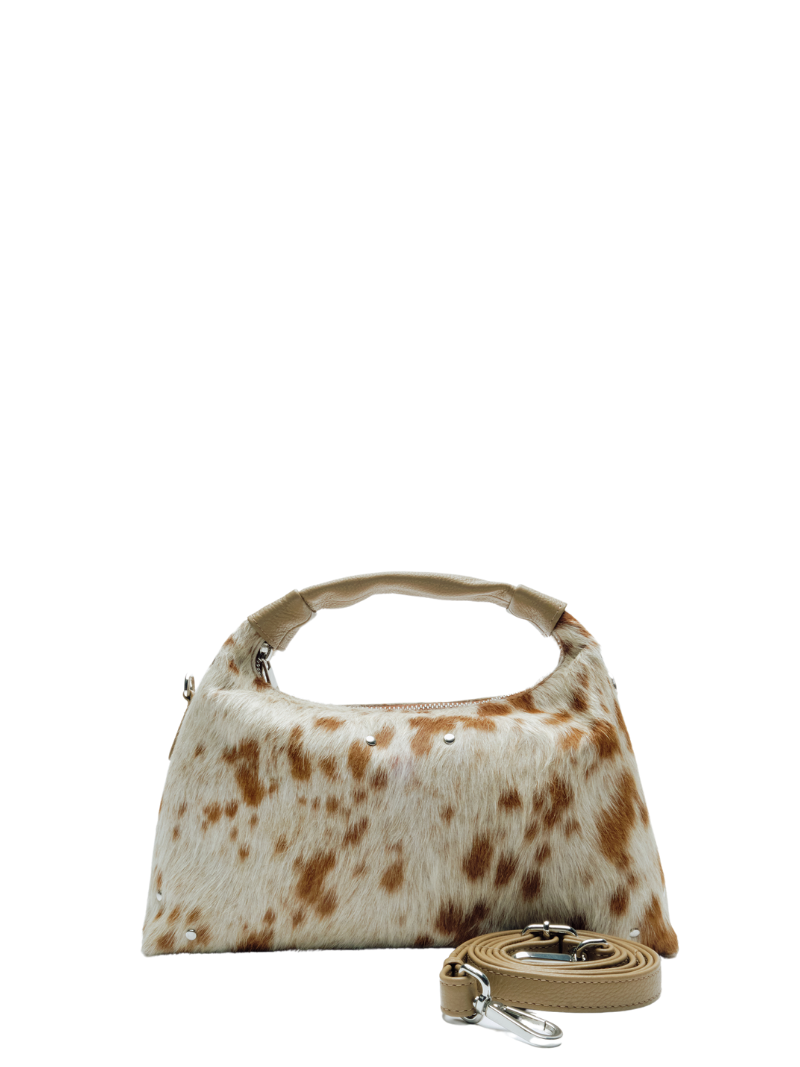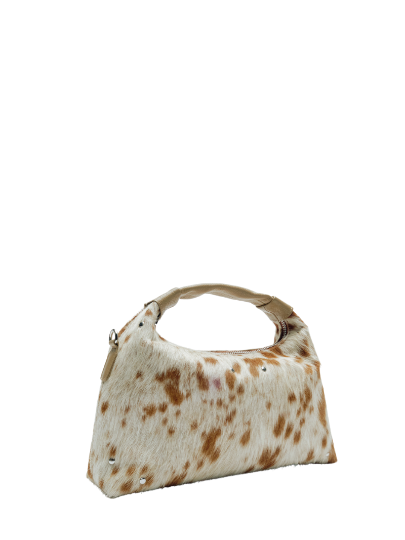 Bolso mediano de estampado de vaca de color marrón y blanco, de mano con un asa corta y una cadena larga para llevarlo cruzado. Confeccionado en 100% piel y con un diseño trenzado. El bolso tiene un compartimento principal con un bolsillo pequeño interior que se cierra con una cremallera.