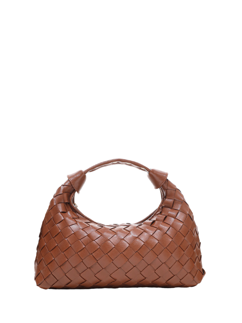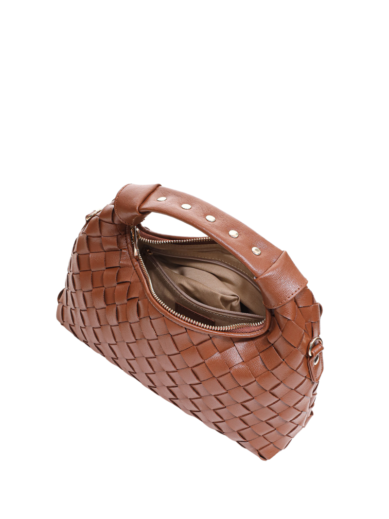 Bolso mediano marrón de mano con un asa corta y una cadena larga para llevarlo cruzado. Confeccionado en 100% piel y con un diseño trenzado. El bolso tiene un compartimento principal con un bolsillo pequeño interior que se cierra con una cremallera.