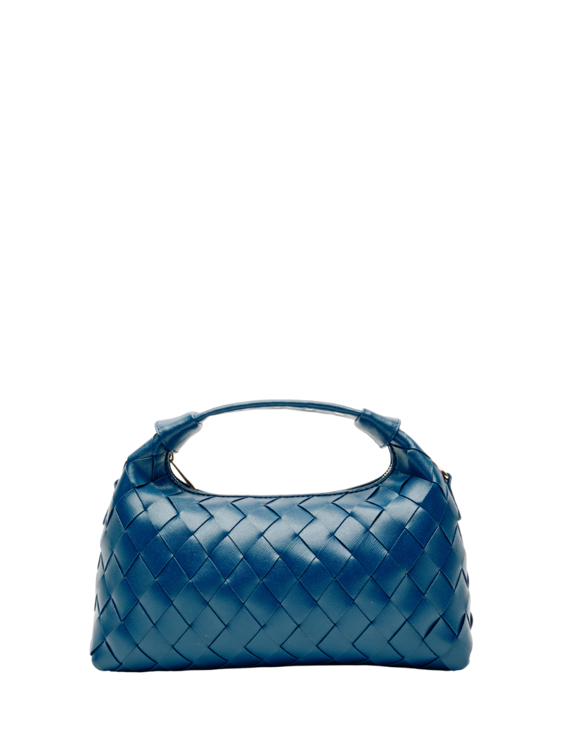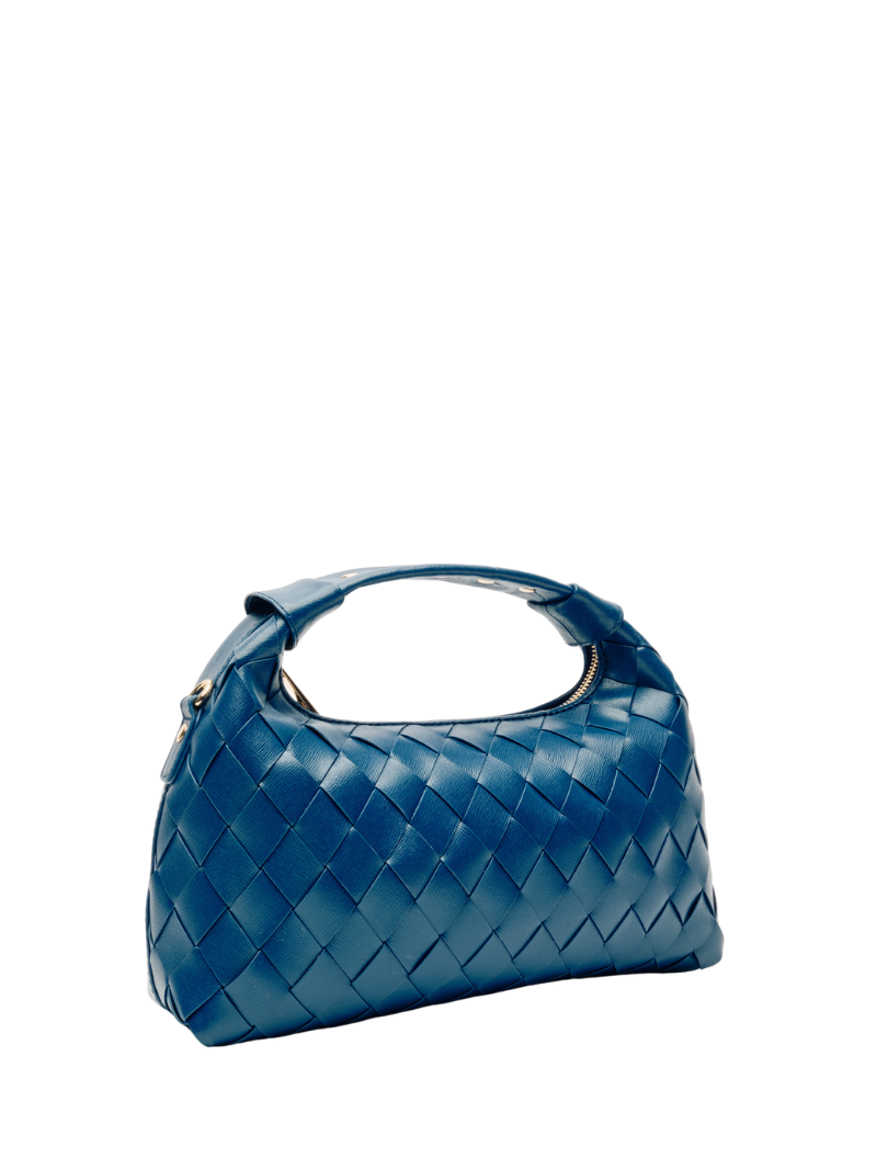 Bolso mediano azul de mano con un asa corta y una cadena larga para llevarlo cruzado. Confeccionado en 100% piel y con un diseño trenzado. El bolso tiene un compartimento principal con un bolsillo pequeño interior que se cierra con una cremallera.