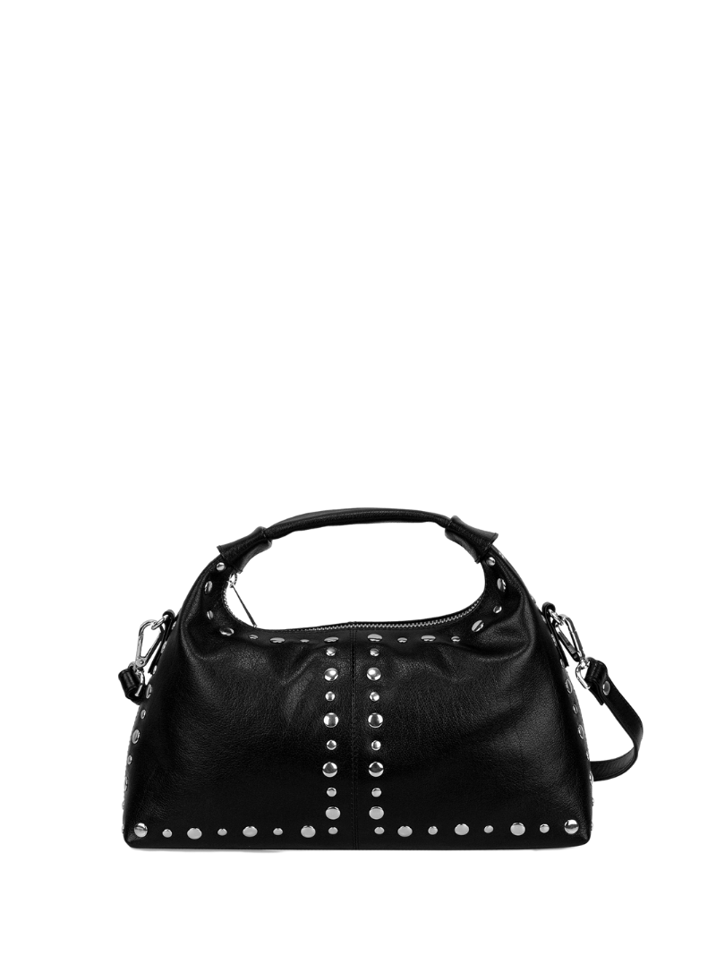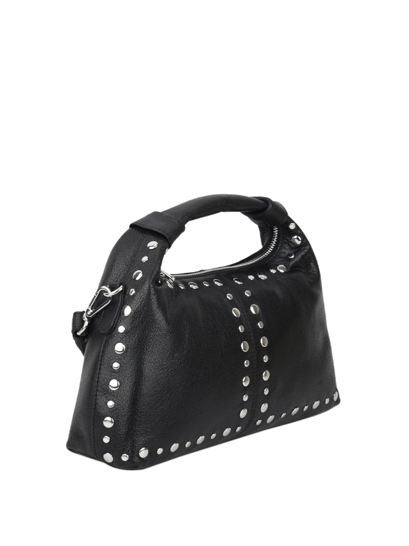 Bolso de mano mediano de piel en color negro con tachuelas plateadas. Este bolso combina elegancia y personalidad en un diseño estructurado y moderno. Las tachuelas metálicas plateadas añaden un toque distintivo y sofisticado, perfecto para quienes buscan un accesorio con carácter.