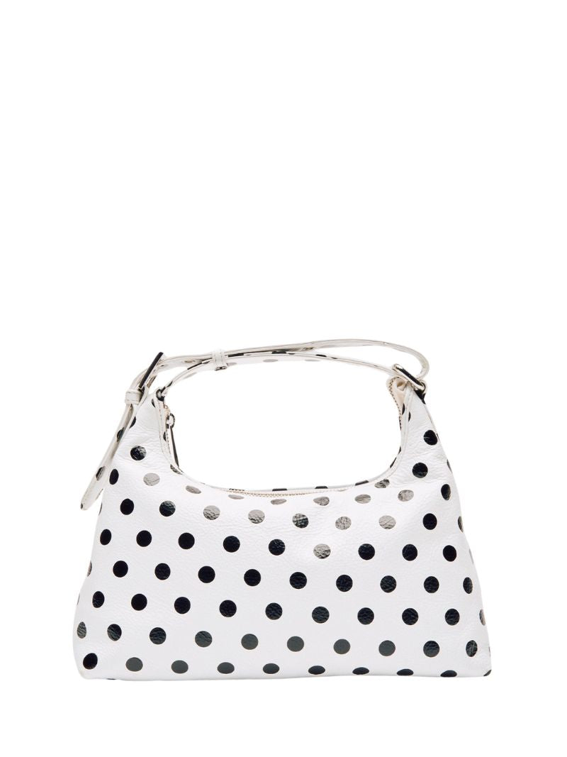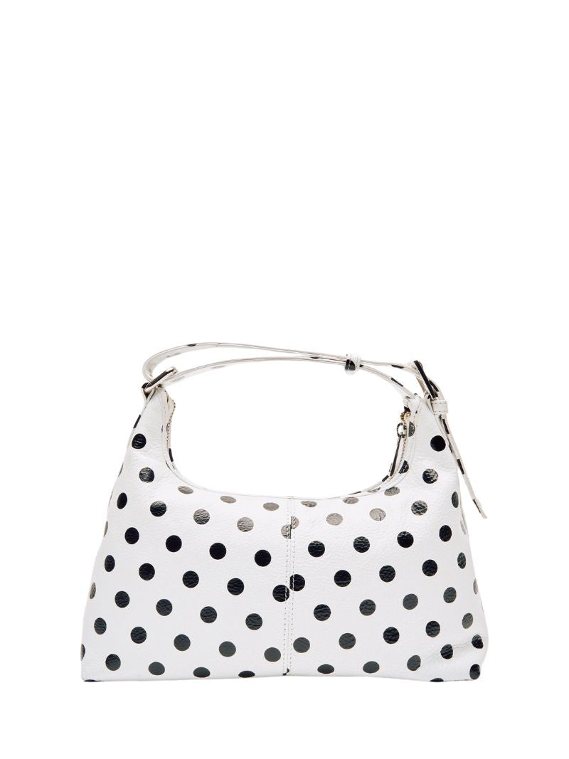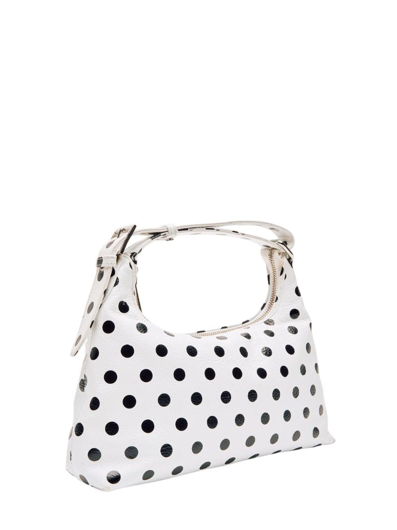 Bolso mediano de piel blanca con estampado de lunares negros, diseñado con detalles plateados en la cremallera y las hebillas.