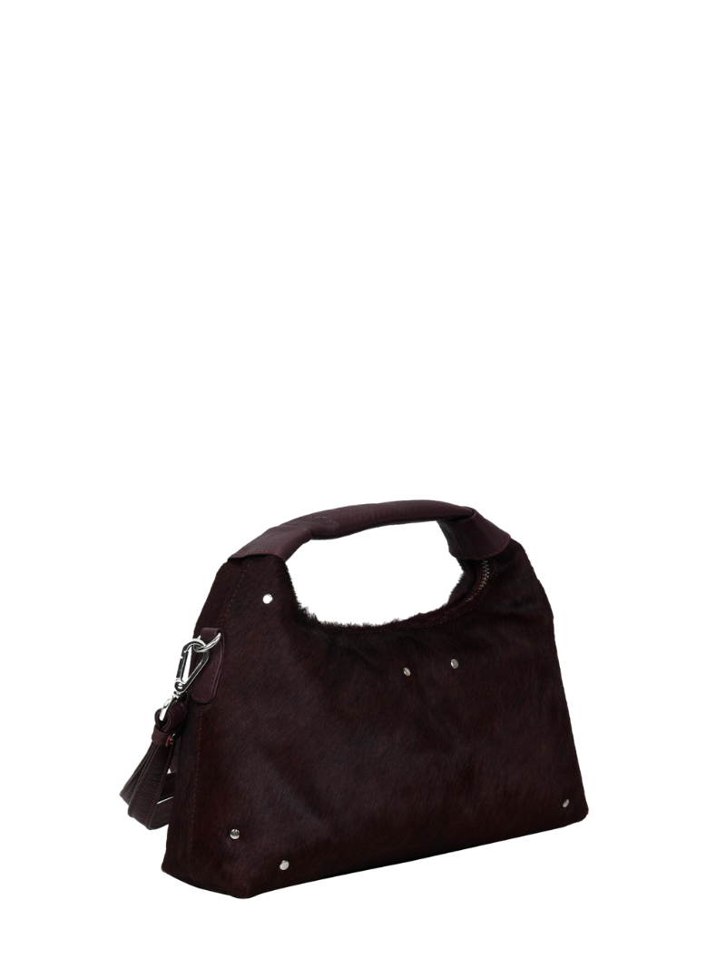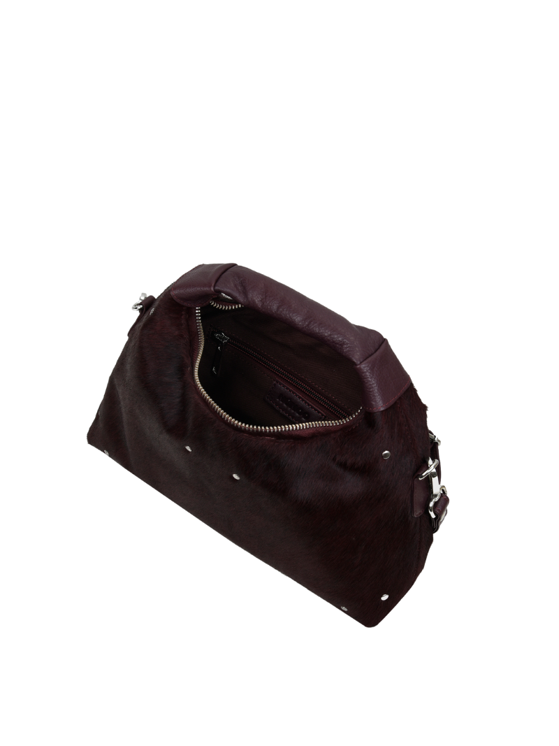 Bolso mediano de color burdeos, de mano con un asa corta y una cadena larga para llevarlo cruzado. El bolso tiene un compartimento principal con un bolsillo pequeño interior que se cierra con una cremallera.