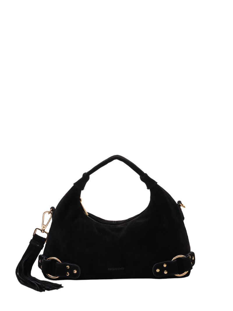 El bolso Dandy de Núnoo es un bolso mediano de mano, con un asa corta y una cadena larga que permite llevarlo cruzado o al hombro. Tiene hebillas y detalles en color dorado que le aportan un toque sofisticado.