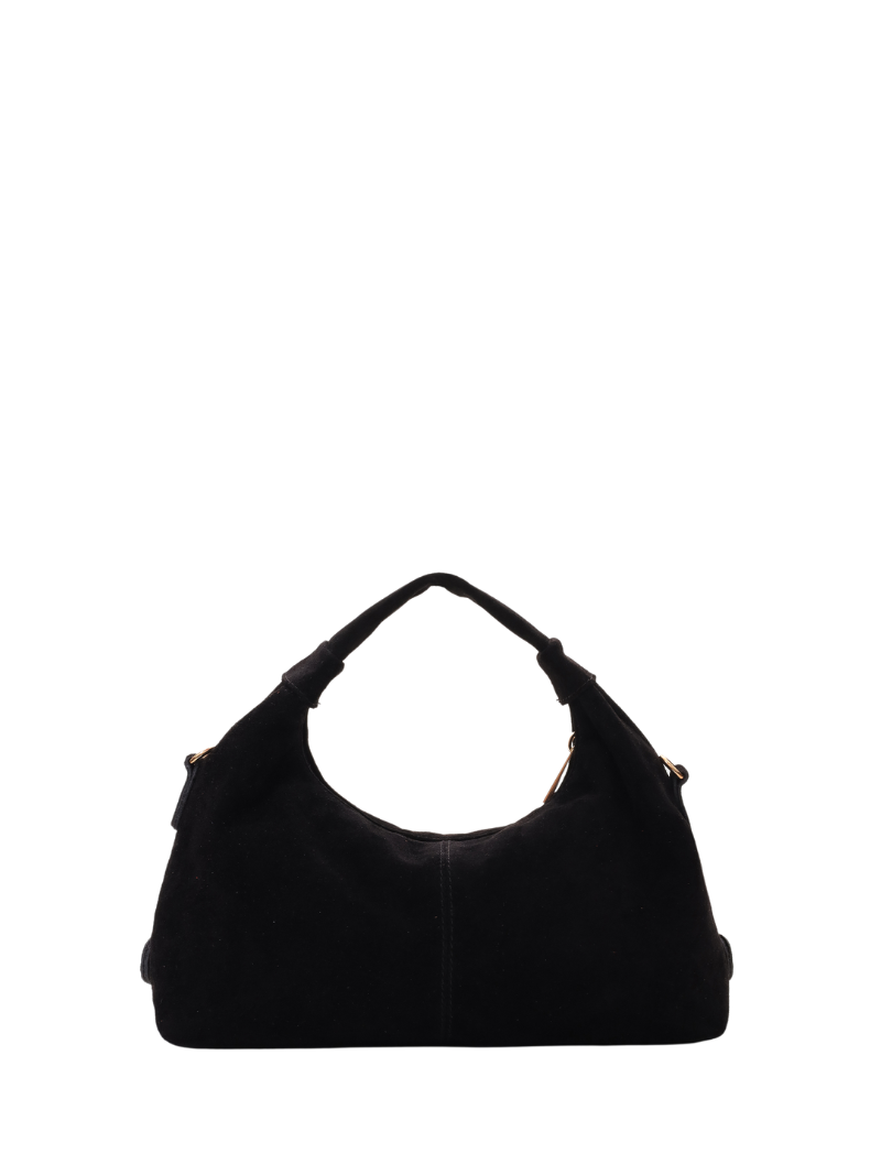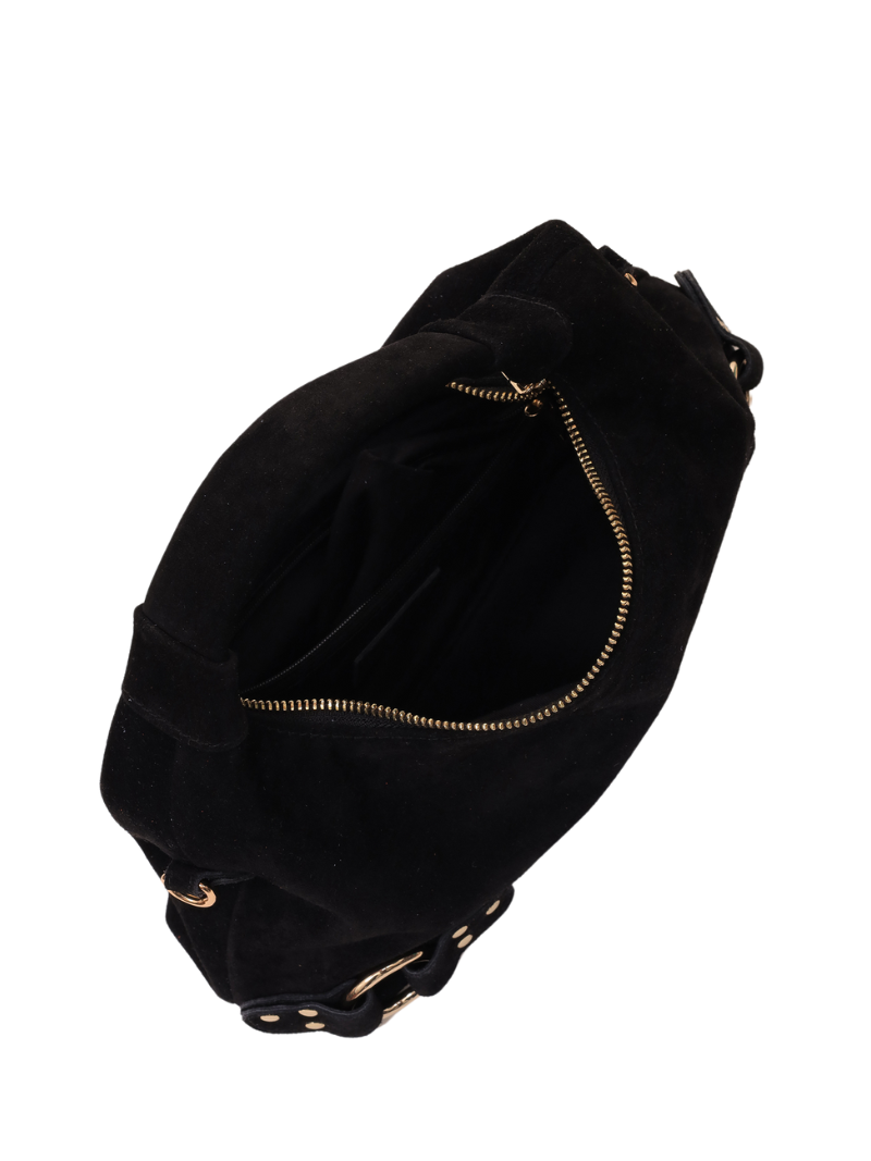 Confeccionado en 100% piel de ante en color negro, cuenta con un compartimento principal y un bolsillo interior pequeño con cierre de cremallera.
