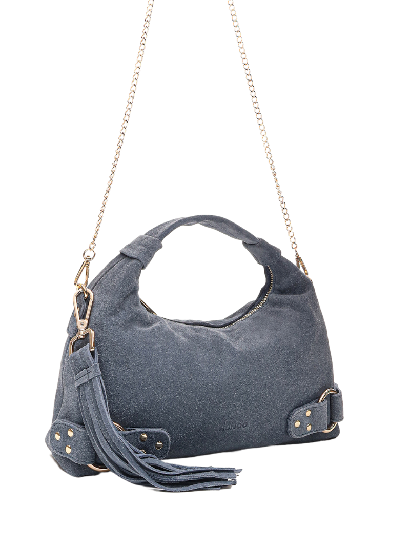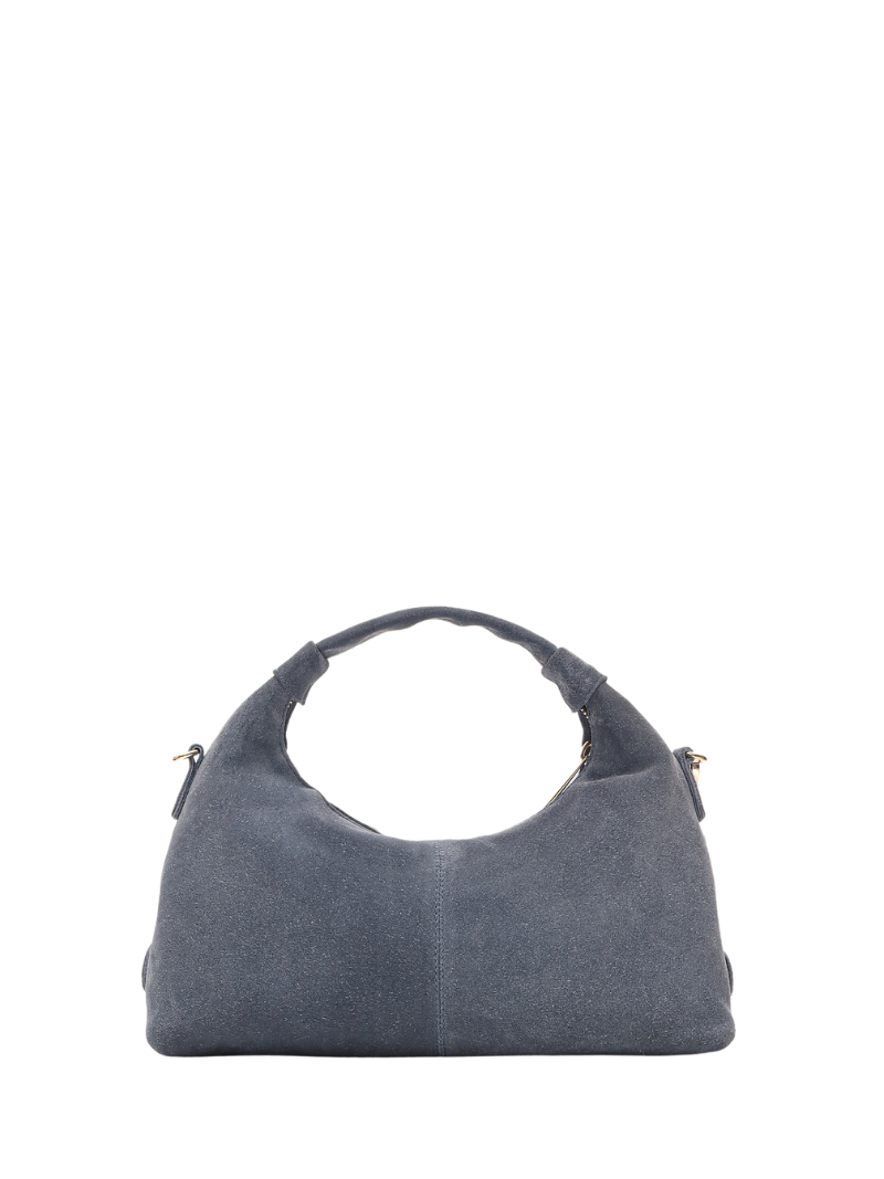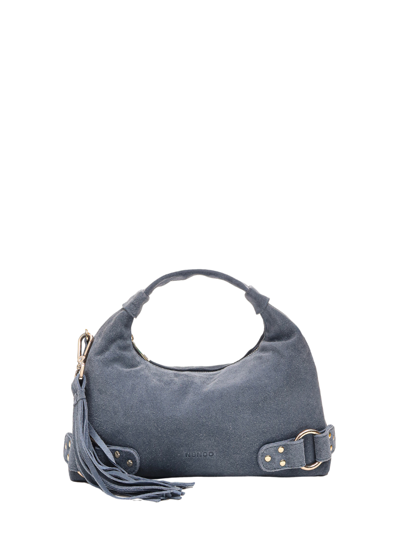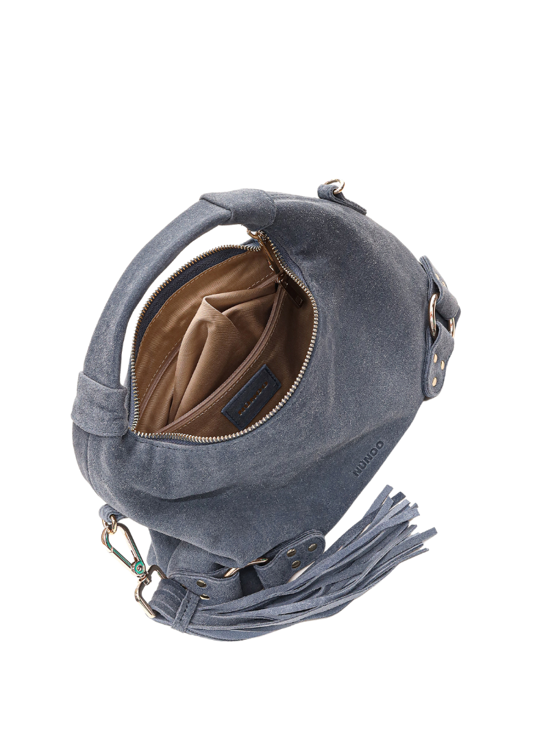 Confeccionado en 100% piel de ante en color azul, cuenta con un compartimento principal y un bolsillo interior pequeño con cierre de cremallera.