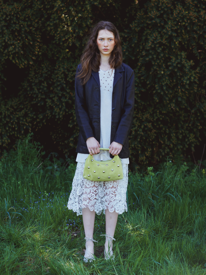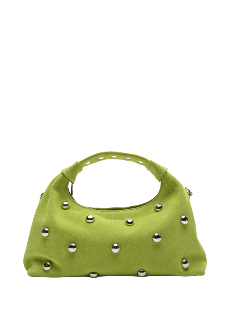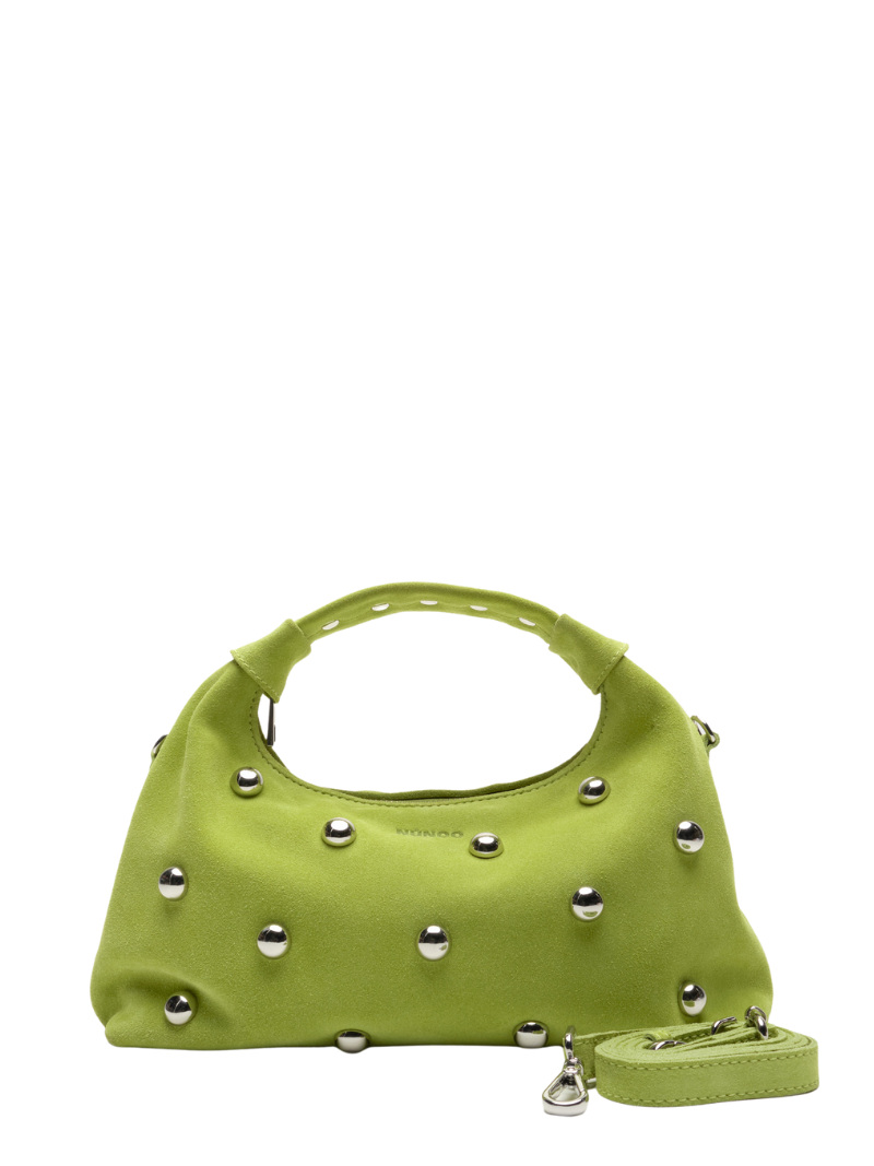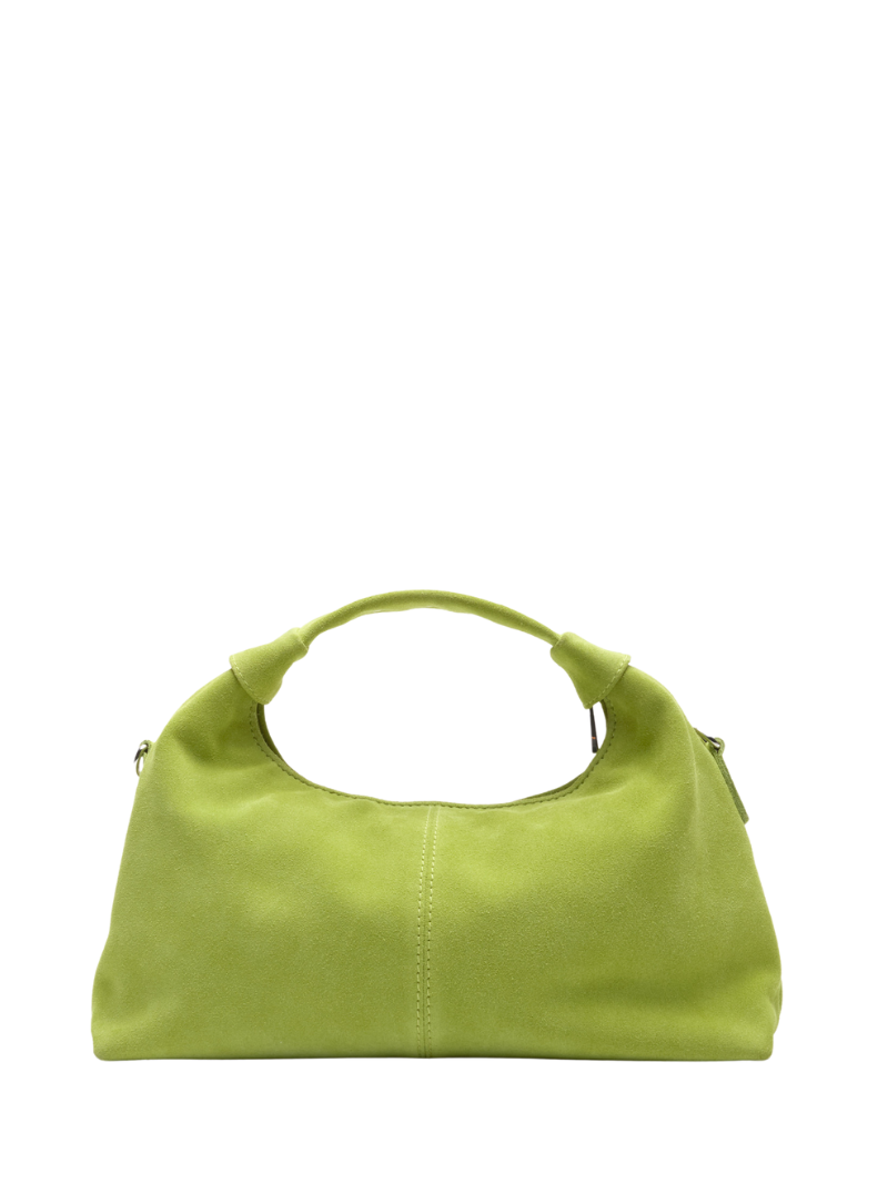 Bolso mediano confeccionado en ante suave de color lima, con un acabado aterciopelado y cálido que aporta una textura sofisticada.