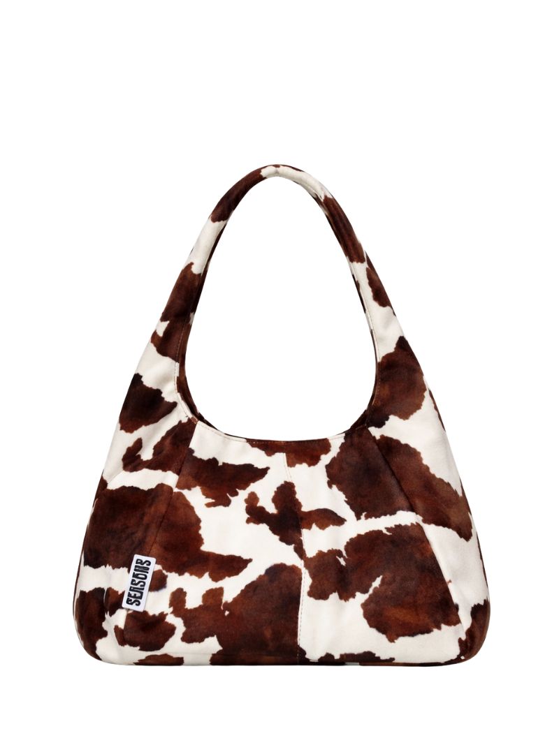 Bolso mediano de hombro con estampado de vaca que combina originalidad, estilo y funcionalidad en un solo accesorio. Su tamaño es perfecto para acompañarte durante el día sin ser voluminoso, pero con espacio suficiente para llevar lo esencial: cartera, móvil, llaves, maquillaje y más.