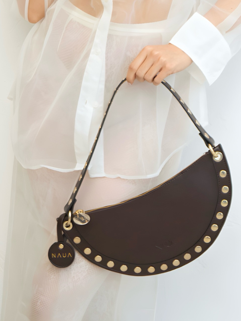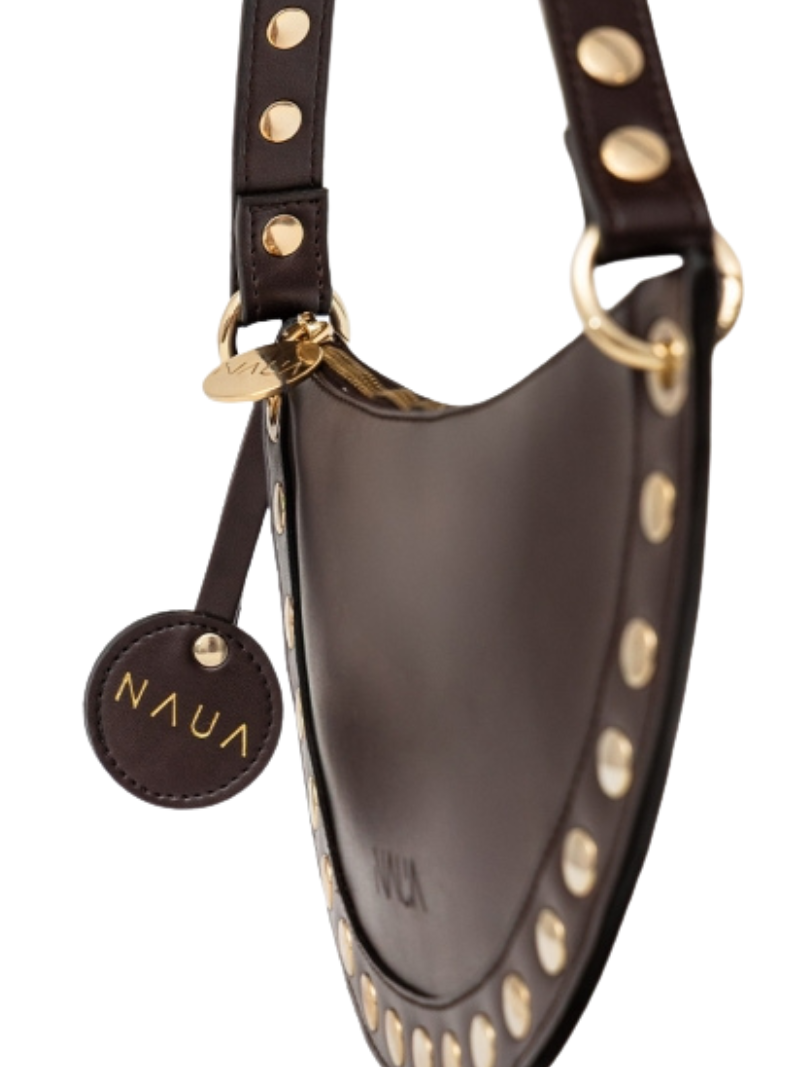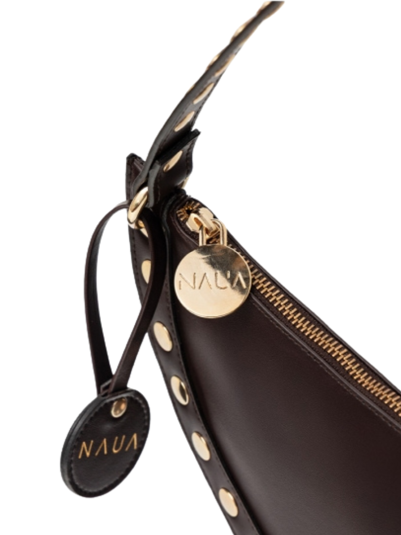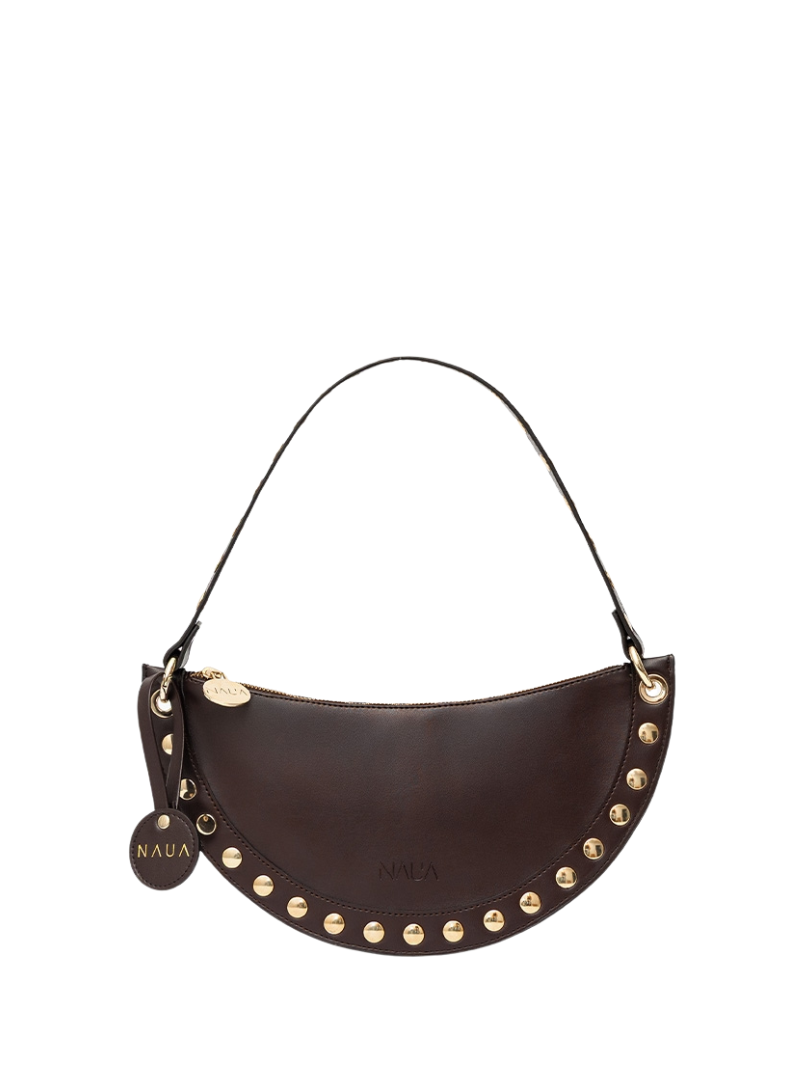 Bolso de hombro de color marrón chocolate con una silueta curva inspirada en el sol naciente. Elaborado artesanalmente en piel vegana, está hecho 100% en España en talleres artesanales.