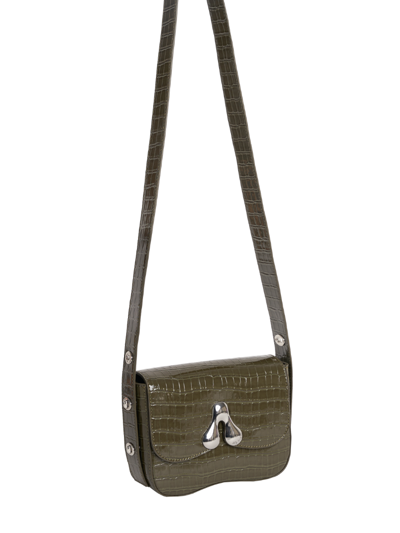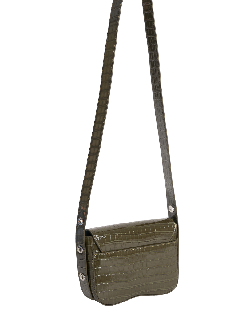 Bolso pequeño cruzado de color verde kaki con acabado efecto cocodrilo y el característico cierre metálico melted en la parte frontal. Su diseño compacto incluye un compartimento principal bajo solapa con cierre magnético y una correa ajustable para llevarlo al hombro o cruzado.