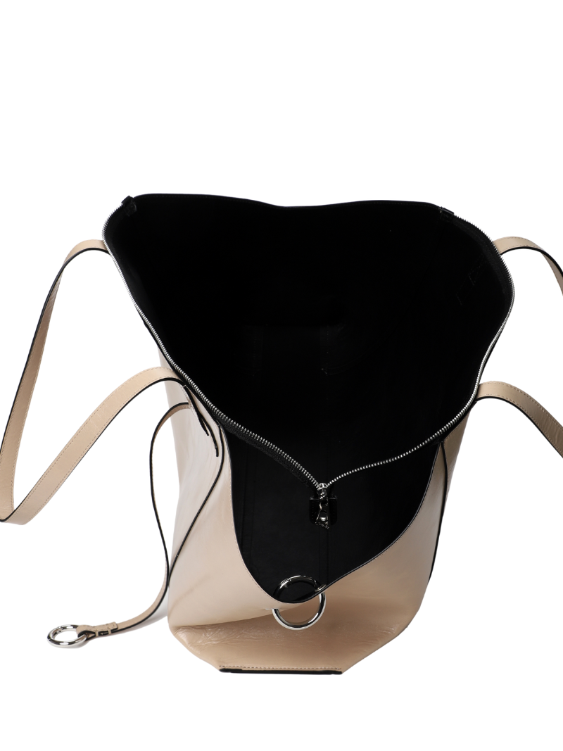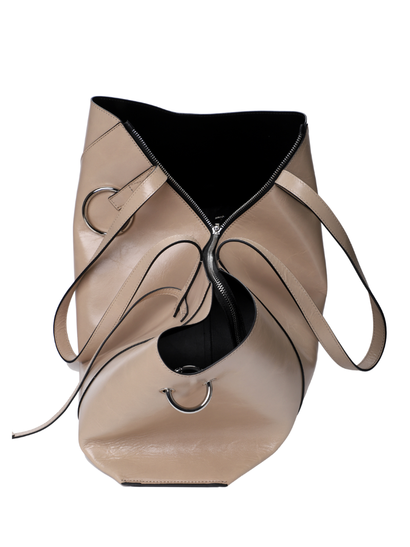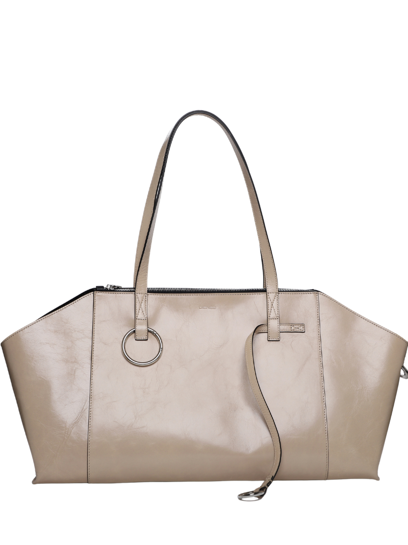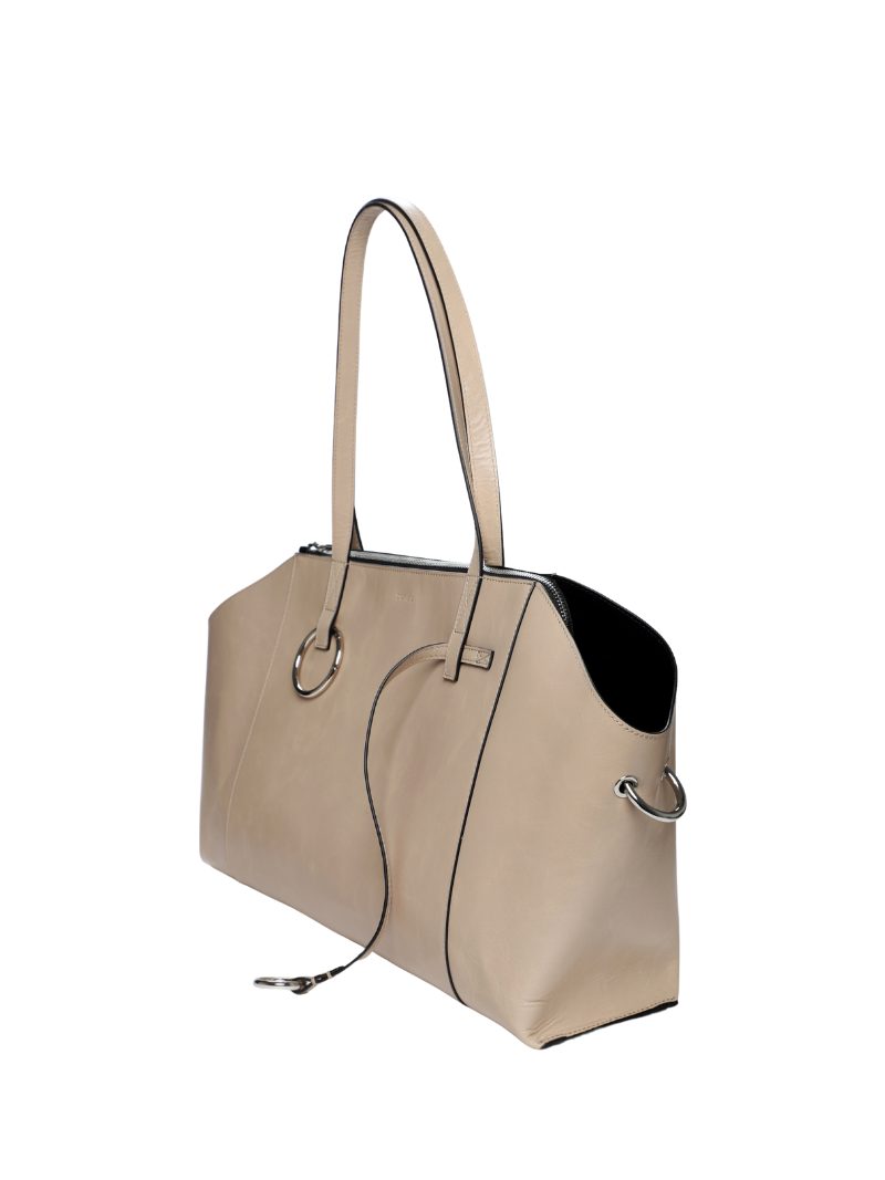 Bolso shopper maxi de piel en color beige y de estructura suave. Su nombre proviene de su diseño versátil, pensado también para escapadas rápidas.