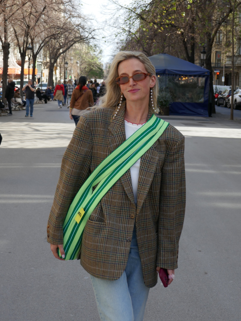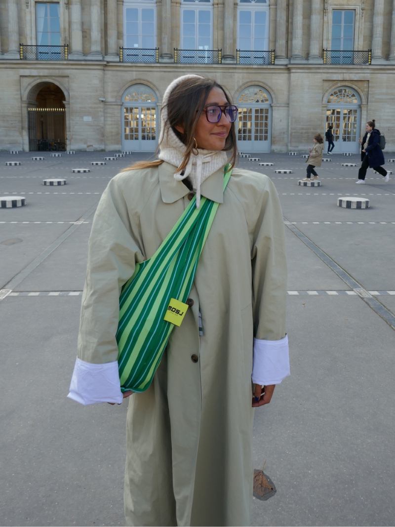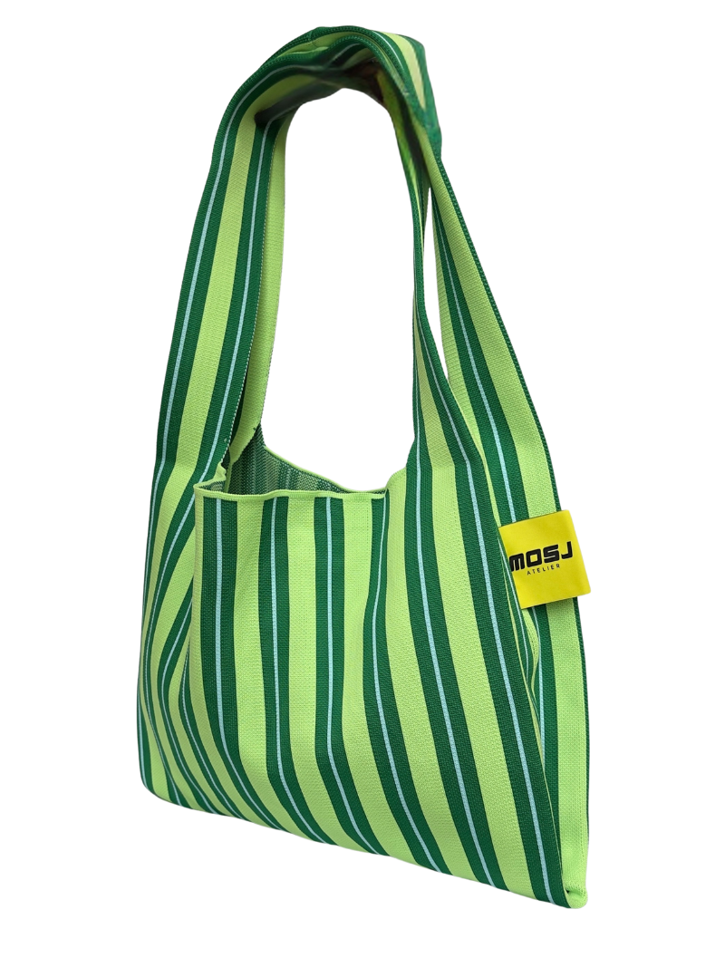 Bolso grande cruzado con estampado de rayas en verde intenso, azul y verde claro. Fabricado en un material elástico, resistente y de gran durabilidad, este bolso es ligero, cómodo de llevar y fácil de lavar, ideal para el uso diario.