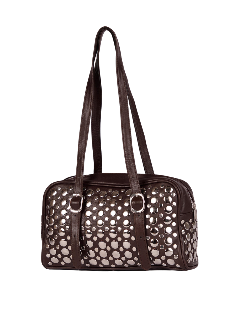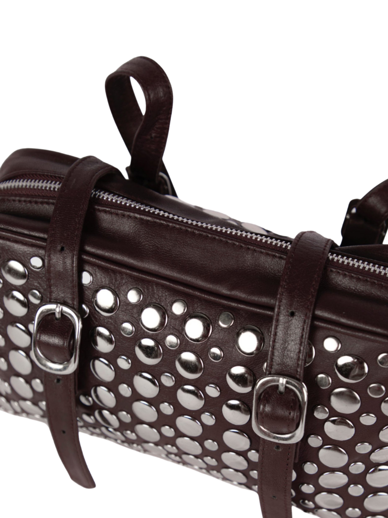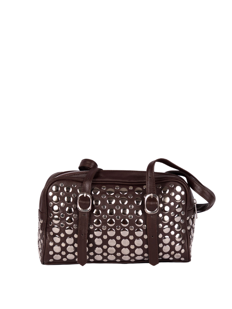 El bolso Goldie es una pieza llamativa y funcional, confeccionada en 100% piel de oveja y adornada con grandes tachuelas metálicas que le dan un aire moderno y audaz.