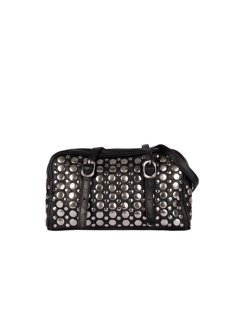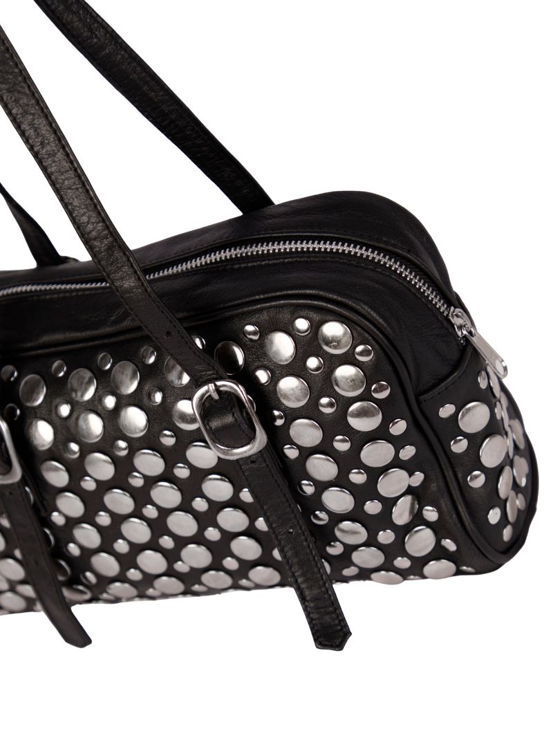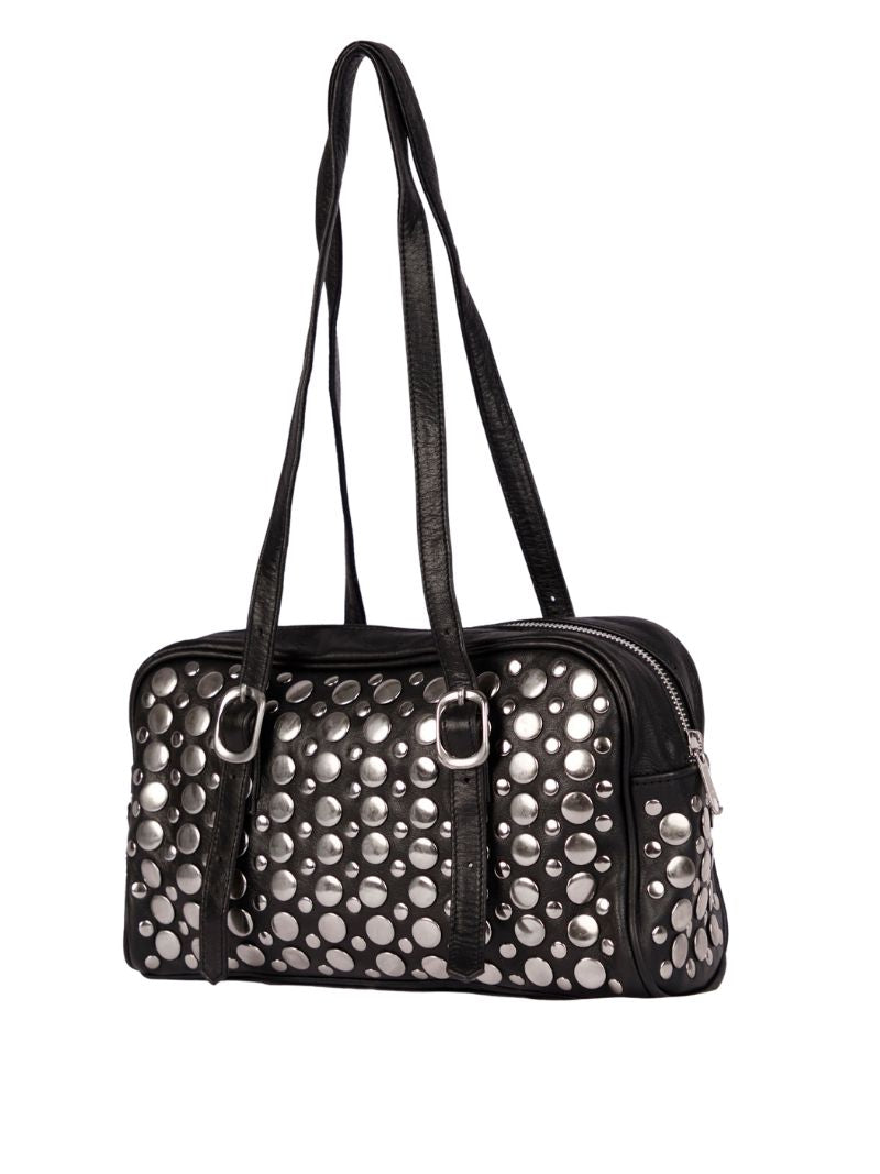 Bolso de hombro confeccionada en 100% piel de oveja en color negra y adornada con grandes tachuelas metálicas que le dan un aire moderno y audaz.