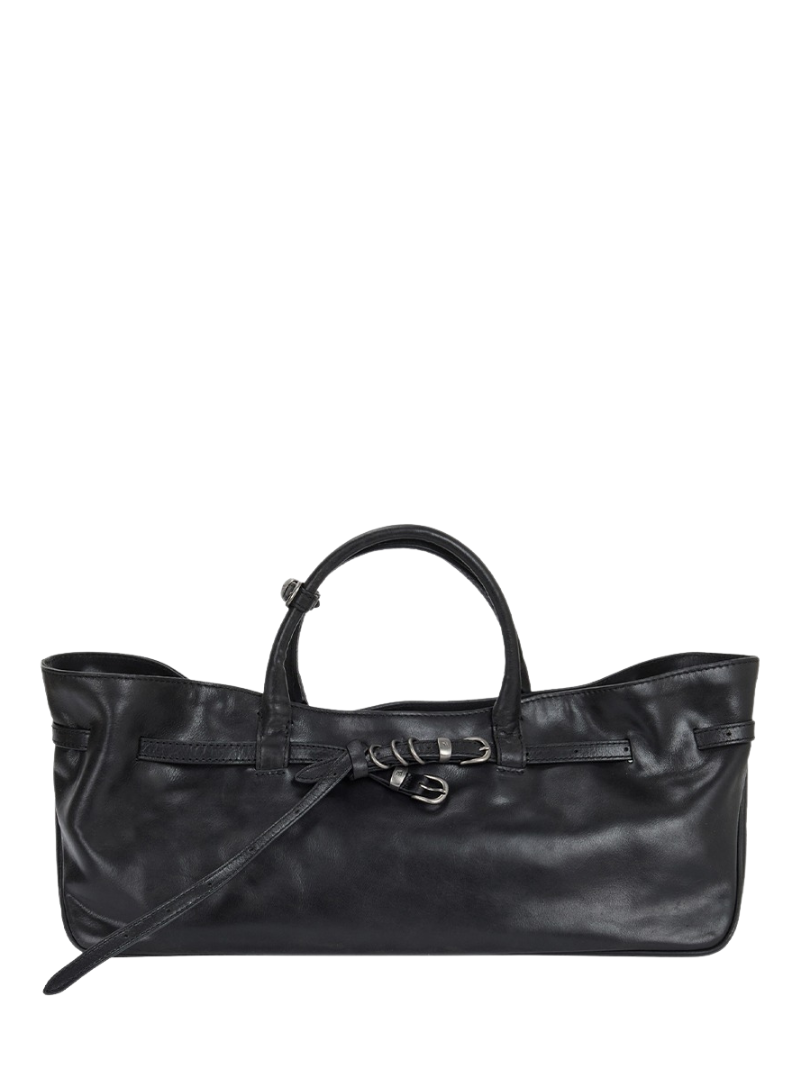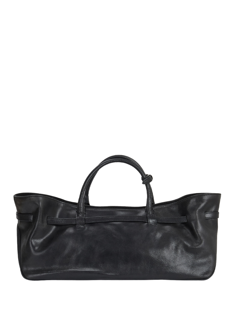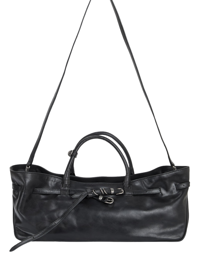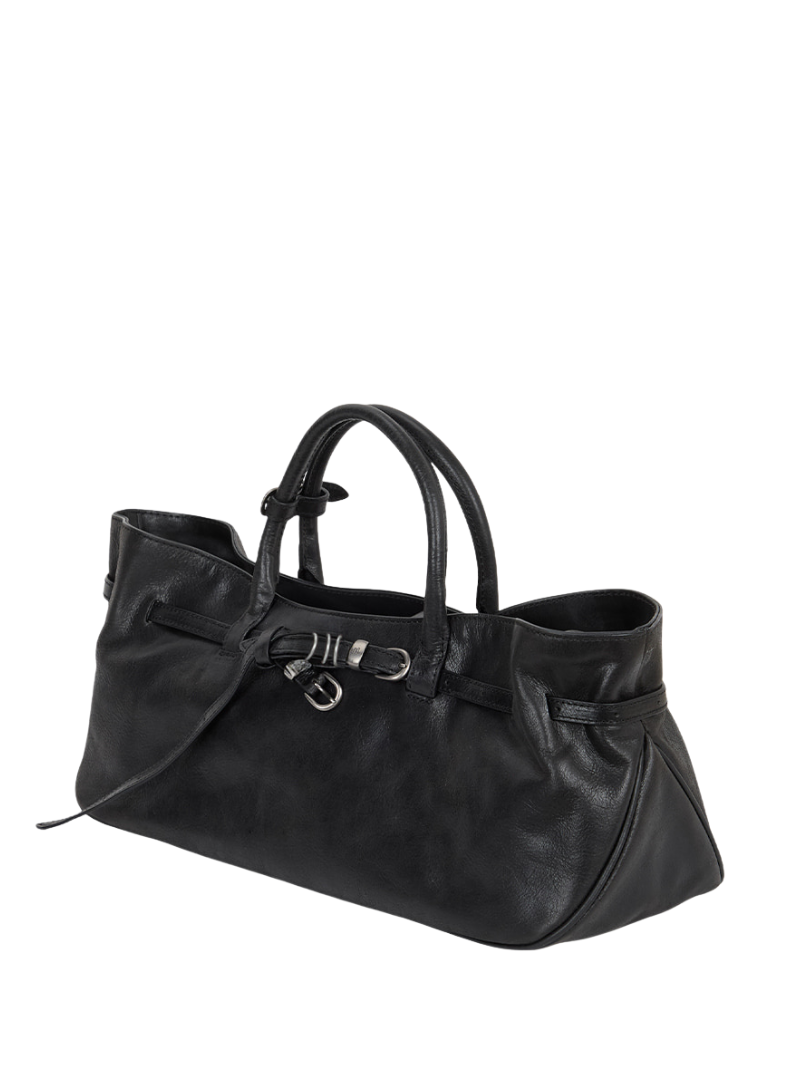 Bolso mediano de piel en color negro que destaca por su diseño moderno y versátil. Cuenta con una correa superior fija estilo tote y una correa de hombro desmontable, lo que permite llevarlo como bolso de mano o cruzado según la ocasión. Su distintiva correa de cinturón anudada le aporta un toque único y contemporáneo. El forro interior de algodón y el bolsillo interno aseguran funcionalidad sin perder estilo.