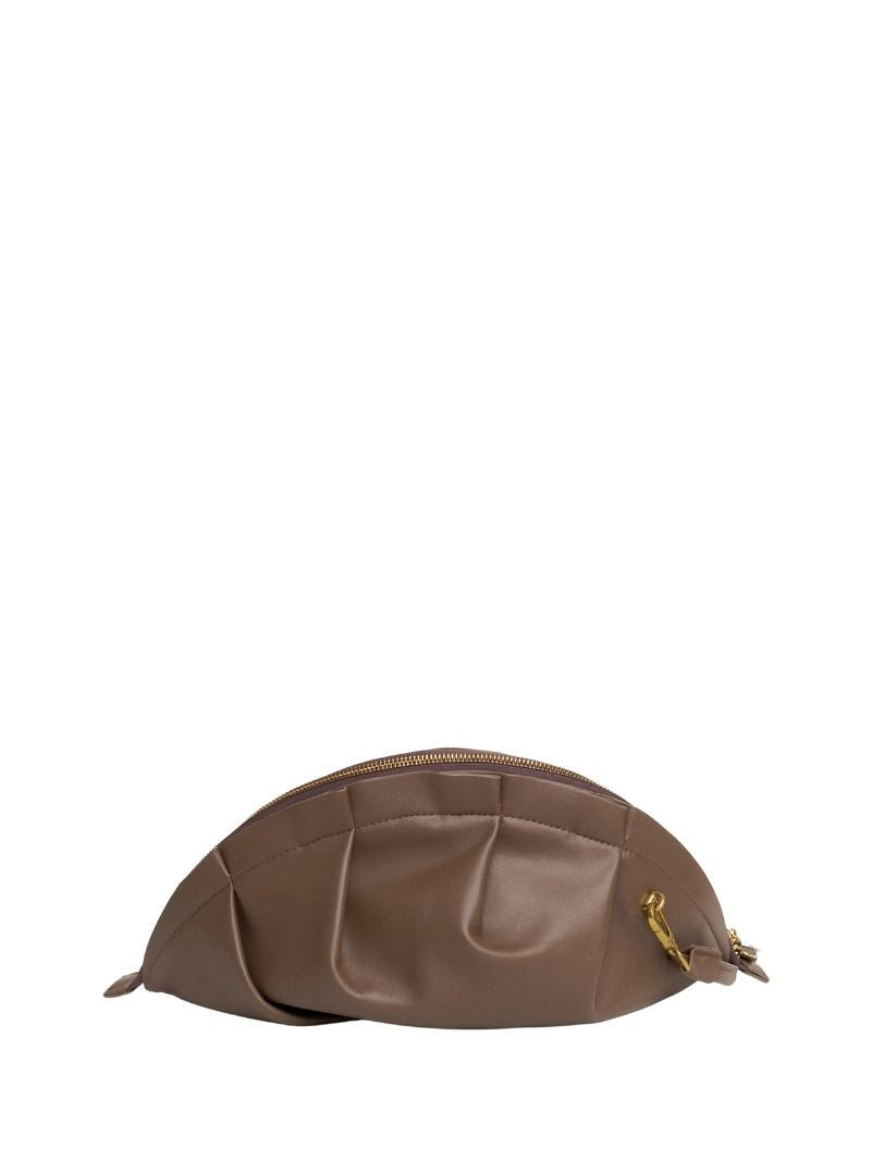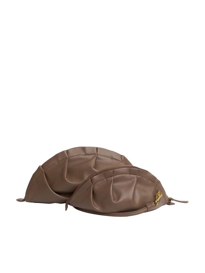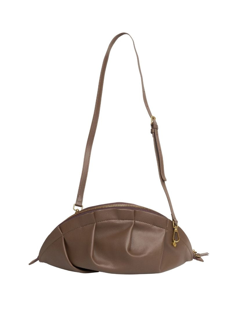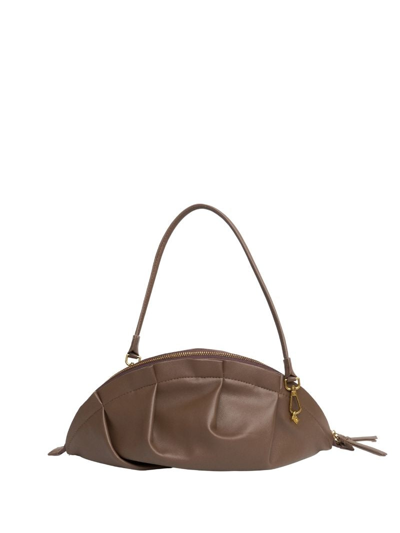 Bolso de hombro de color topo con una silueta suave y orgánica inspirada en la delicadeza de las gyozas. Su diseño fruncido y estructurado le da ese punto especial que transforma cualquier look, del más casual al más sofisticado.