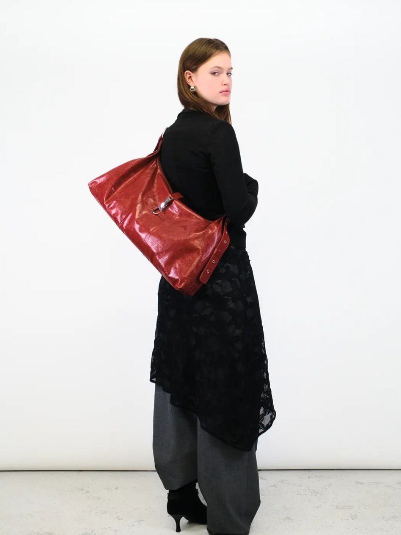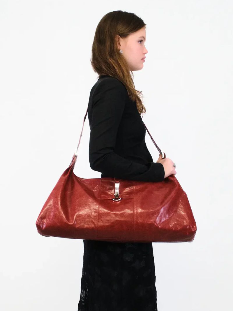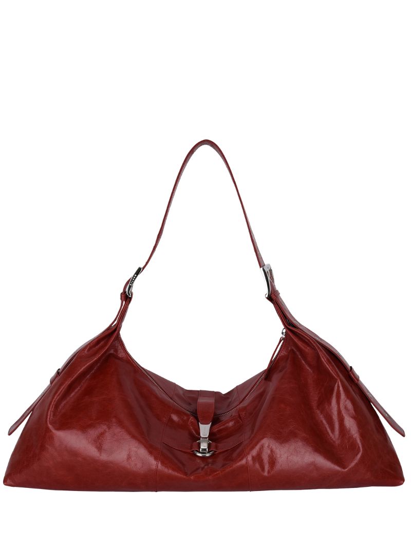 Bolso de hombro de piel en color rojo de diseño minimalista que combina estilo y funcionalidad para el día a día. Su silueta suave y ligera, junto con el asa cómoda y los sutiles detalles metálicos, aporta un toque moderno y elegante.