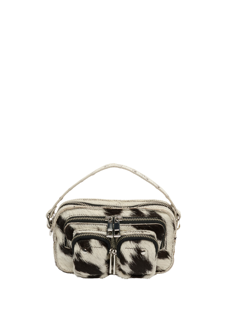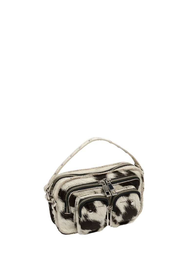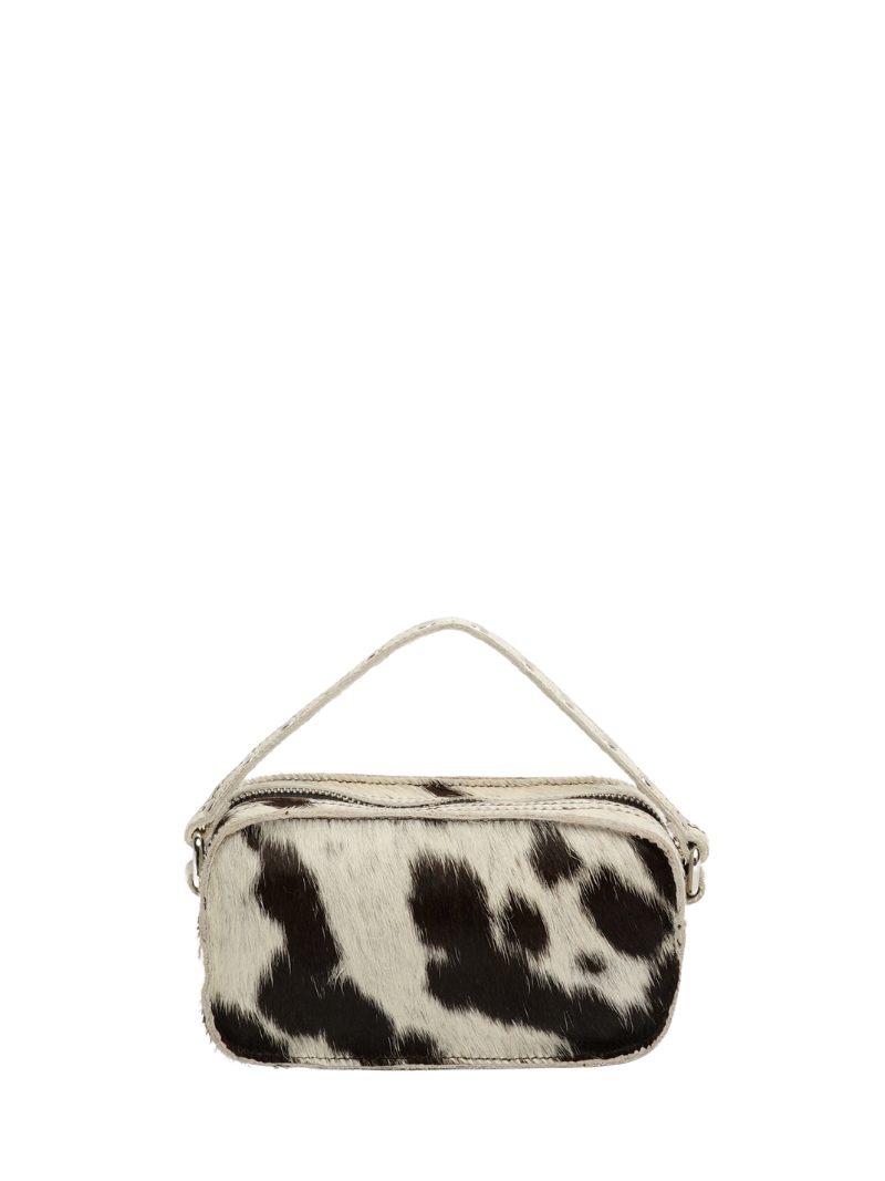 Bolso pequeño de piel, de estampado de vaca de los colores negro y blanco, con las cremalleras y las tachuelas en plateado.