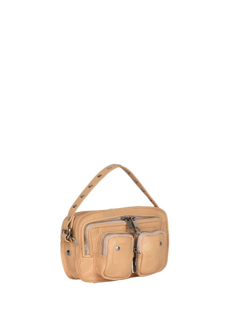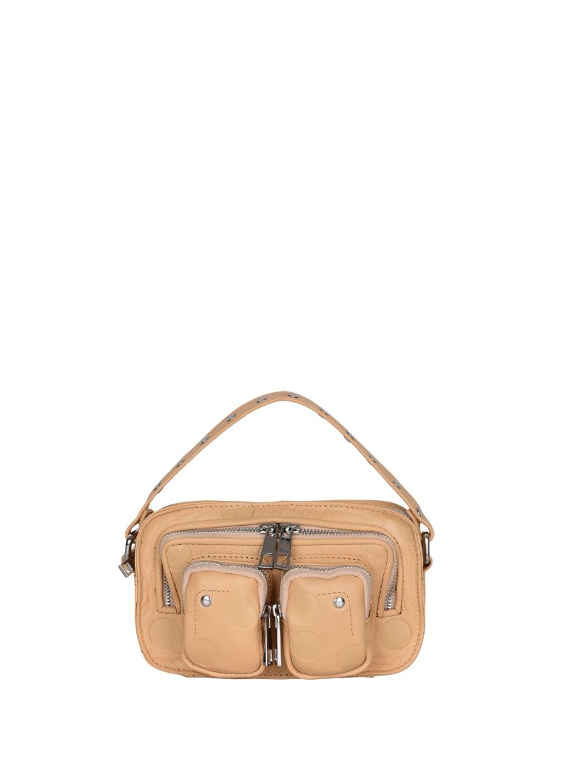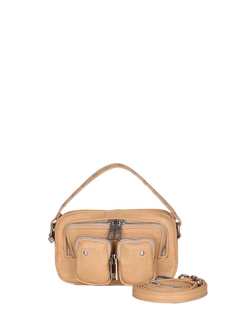 En los modelo Helena de Núnoo cabe perfectamente el teléfono móvil, una cartera, las llaves, un labial o similar. Cuenta con varios compartimentos y con dos correas: una corta de piel y con tachuelas para coger con la mano y otra, extraíble y ajustable, de piel para poder cruzar el bolso a tu cuerpo.
