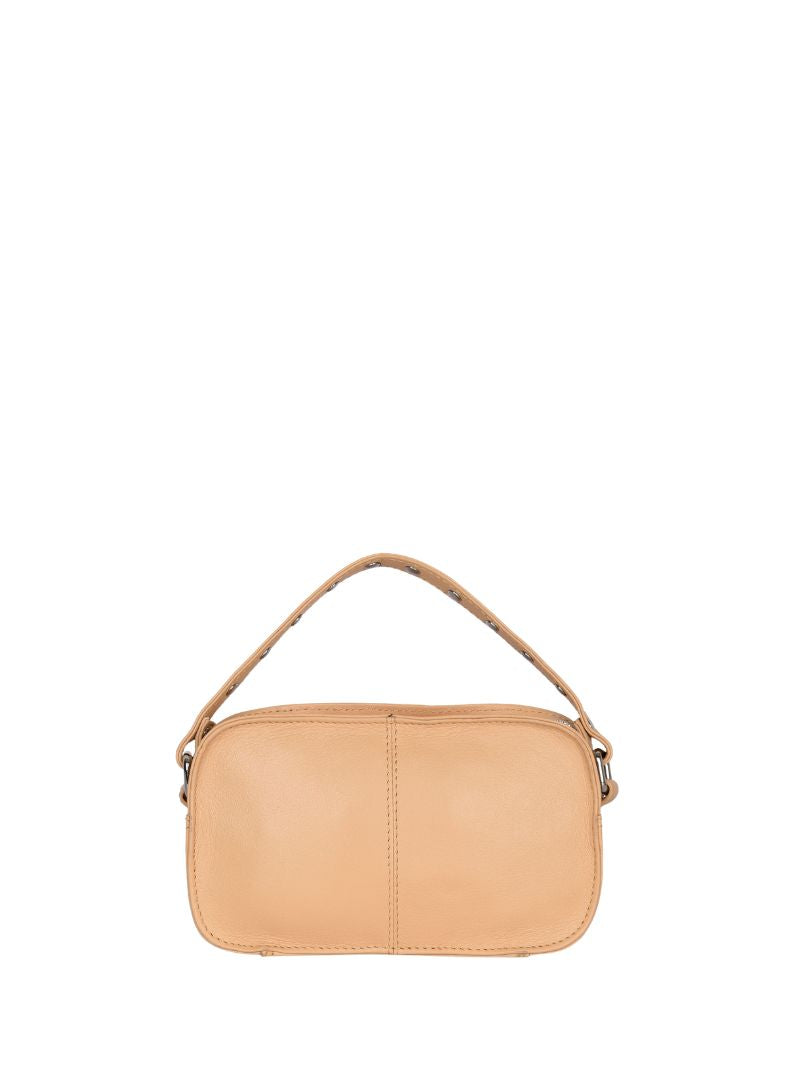 Bolso de piel pequeño de color crema, con las cremalleras y las tachuelas plateadas.