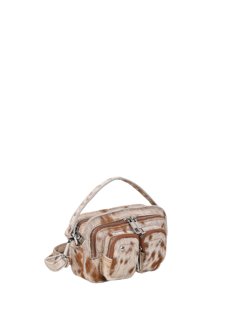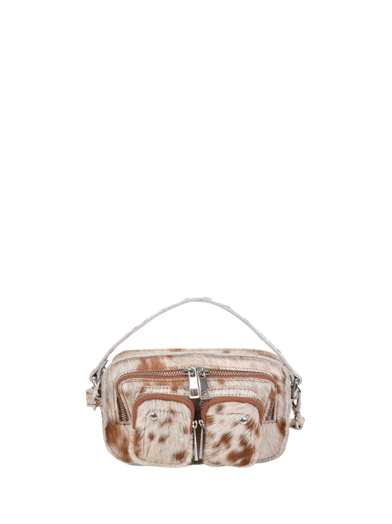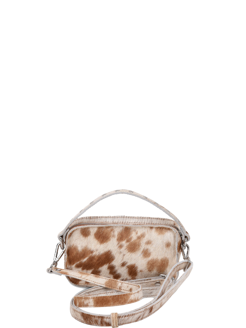 Bolso pequeño de piel en estampado de vaca marrón y blanco, con las cremalleras y las tachuelas en plateado.