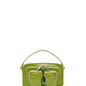 Bolso pequeño de piel de color verde oliva con las cremalleras y las tachuelas plateadas, en forma de círculo.