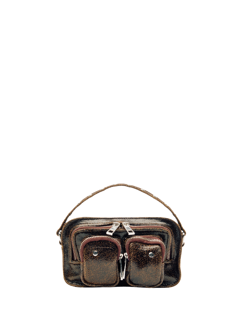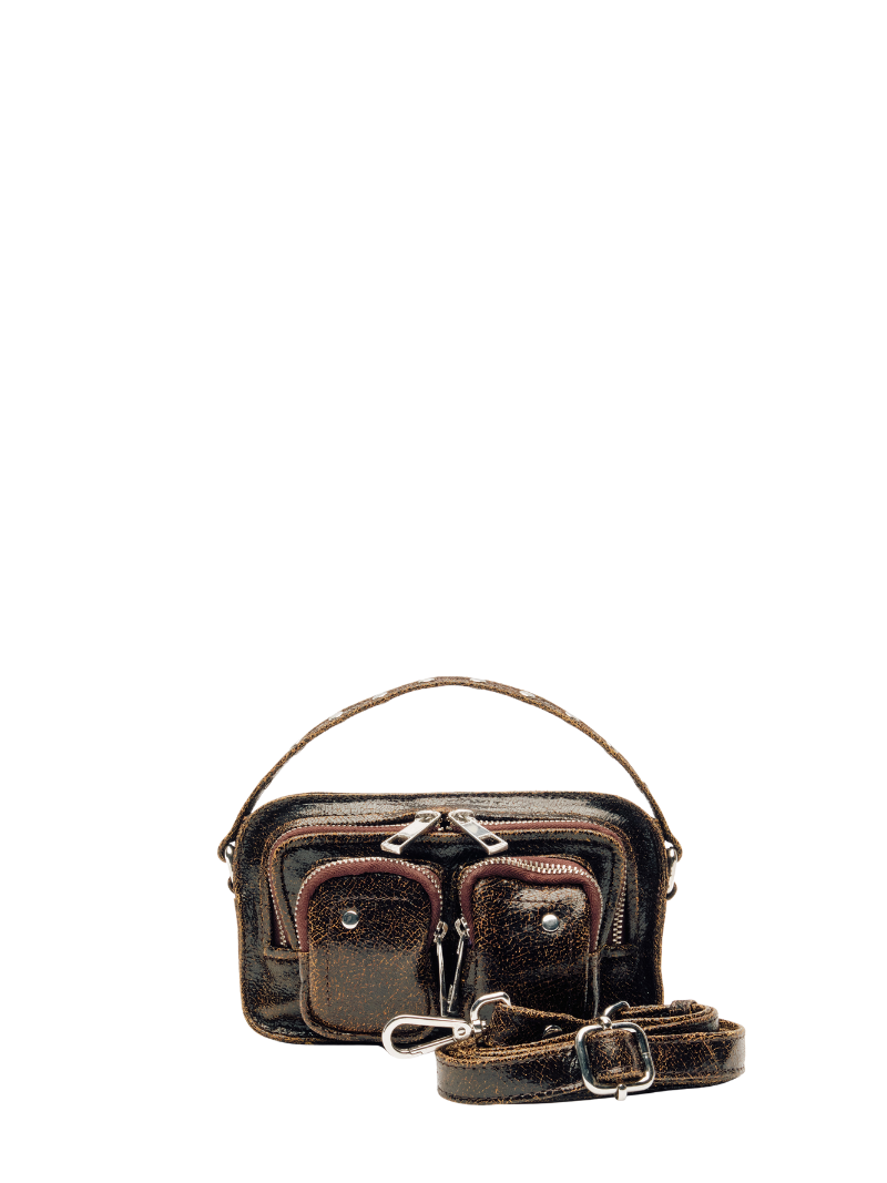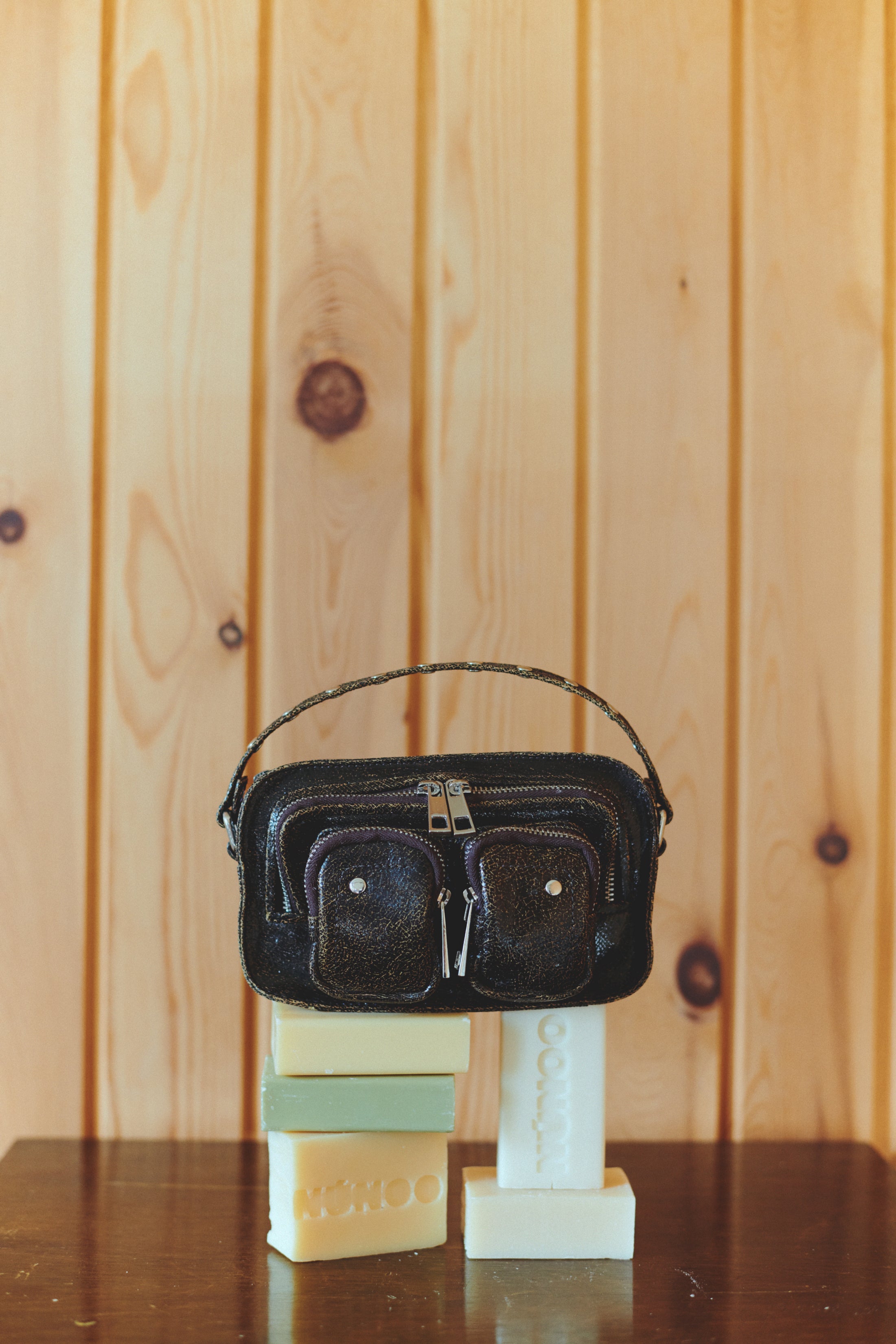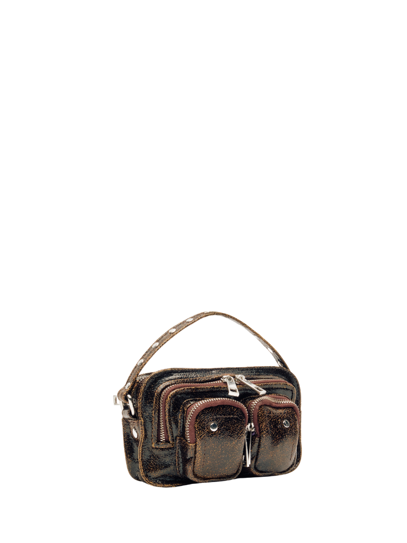 En los modelos Helena de Núnoo cabe perfectamente el teléfono móvil, una cartera, las llaves, un labial o similar. Cuenta con varios compartimentos y con tres correas: una corta de piel y con tachuelas para coger con la mano, una cadena larga extraíble  y otra, también extraíble y ajustable, de piel para poder cruzar el bolso a tu cuerpo.