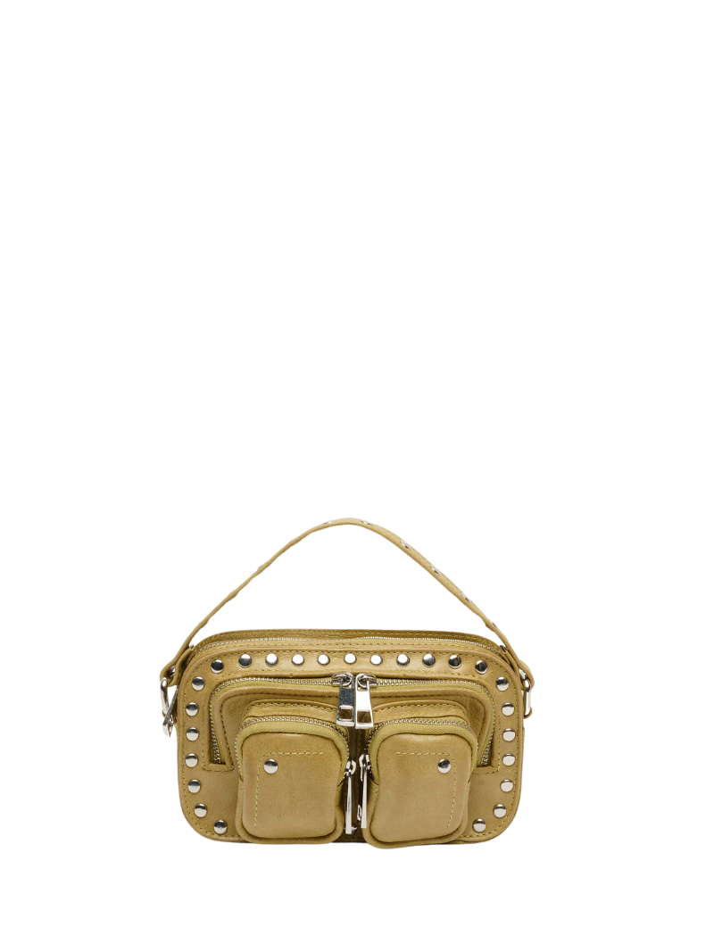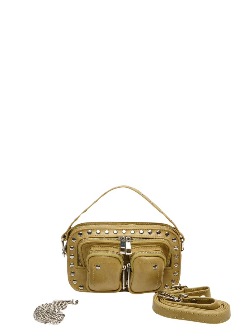 En los modelos Helena de Núnoo cabe perfectamente el teléfono móvil, una cartera, las llaves, un labial o similar. Cuenta con varios compartimentos y con tres correas: una corta de piel y con tachuelas para coger con la mano, una cadena larga extraíble  y otra, también extraíble y ajustable, de piel para poder cruzar el bolso a tu cuerpo.