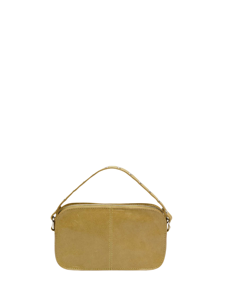 Bolso pequeño de piel, con las cremalleras y las tachuelas en plateado.