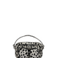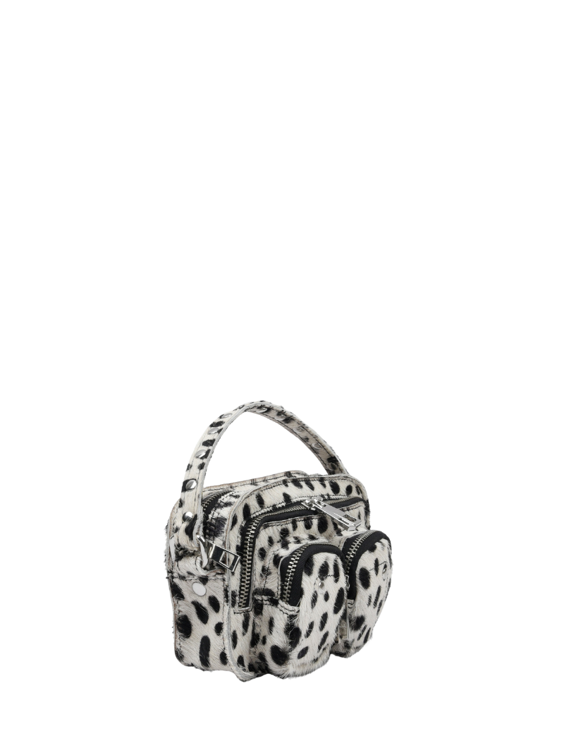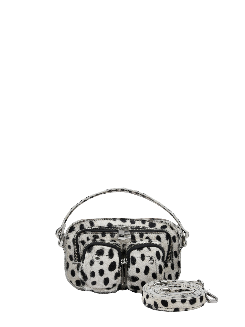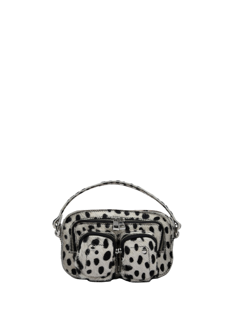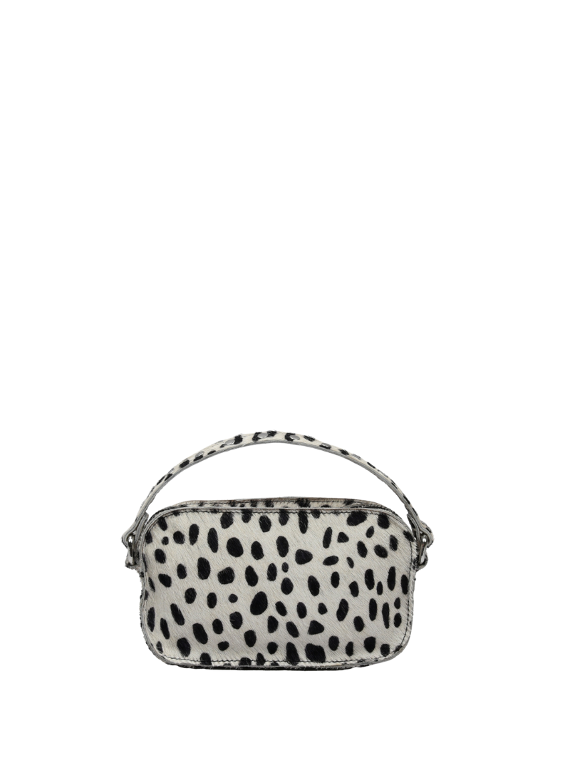 Bolso pequeño de pelo con estampado de dálmata, con las cremalleras y las tachuelas plateadas.