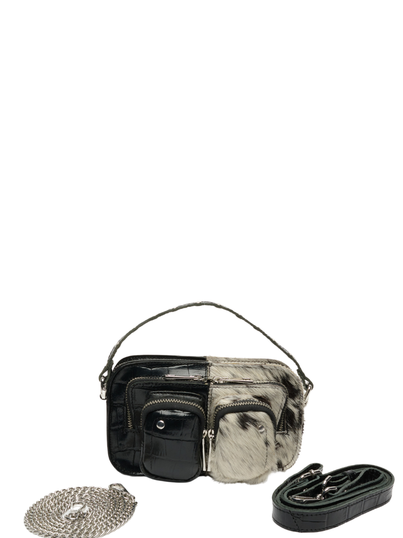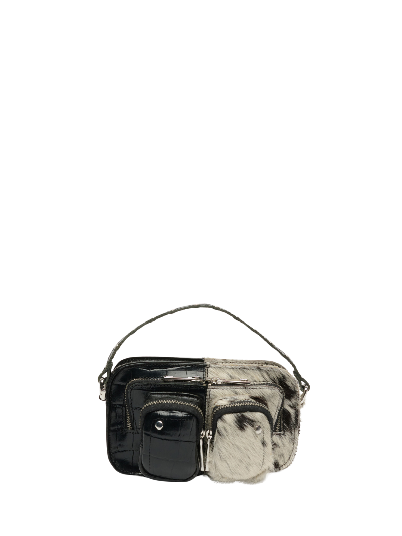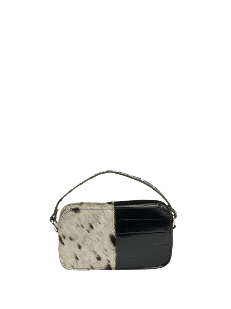 Bolso pequeño de piel en negro y animal print de vaca. Este exclusivo bolso combina piel negra con textura arrugada en una mitad y piel con estampado de vaca en la otra, creando un contraste único y sofisticado. Cuenta con múltiples bolsillos con cremalleras en tono plateado y una correa a juego, ideal para quienes buscan un accesorio versátil y con personalidad. Perfecto para elevar cualquier look con un toque de estilo audaz.