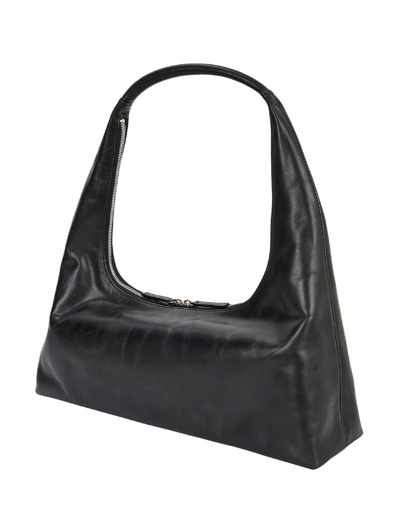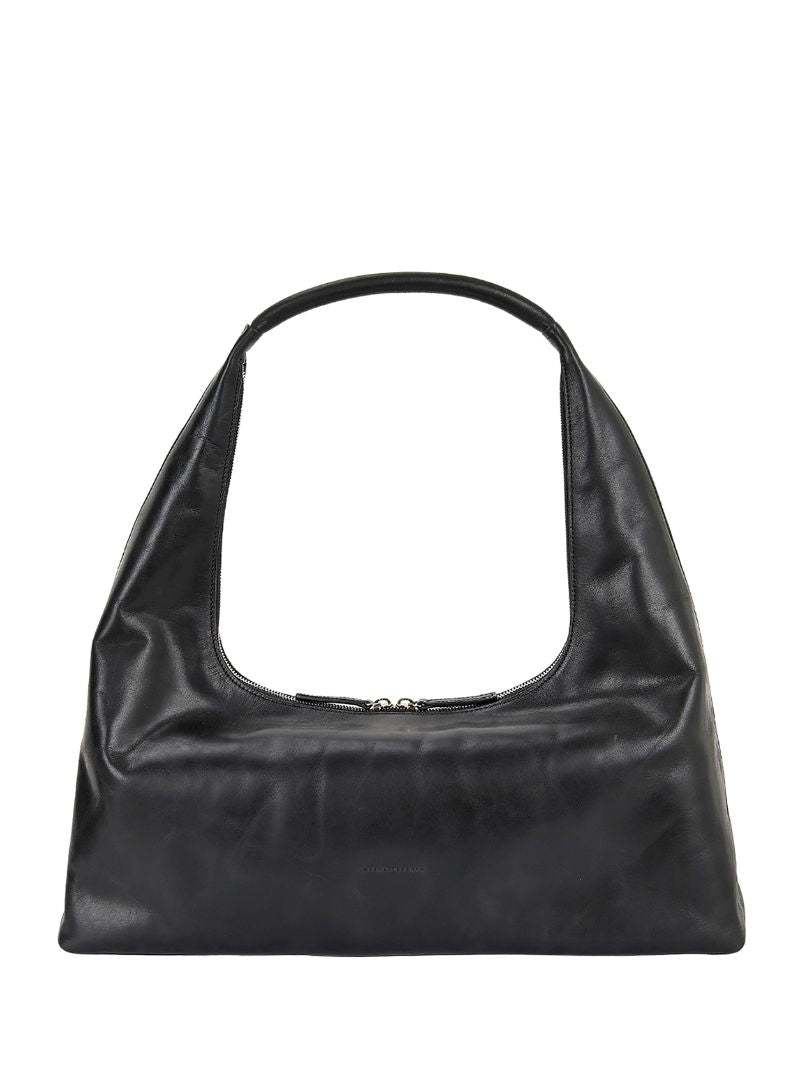 Bolso Margesherwood mediano hobo de piel de color negro, con el nombre de la marca grabado en la parte frontal. Este modelo se caracteriza por su piel suave.