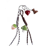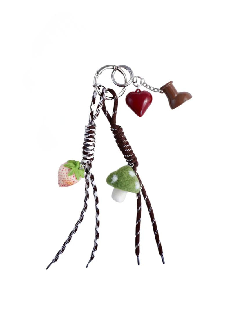 El charm Into the woods de Ferent Bags es un accesorio imprescindible para personalizar tu bolso, con un corazon en color rojo, una bota de color marrón, dos cuerdas de color granate y blanco, junto a un champiñón y una fresa, por último un lazo rojo y un clip con dados con cuadros Vichy.