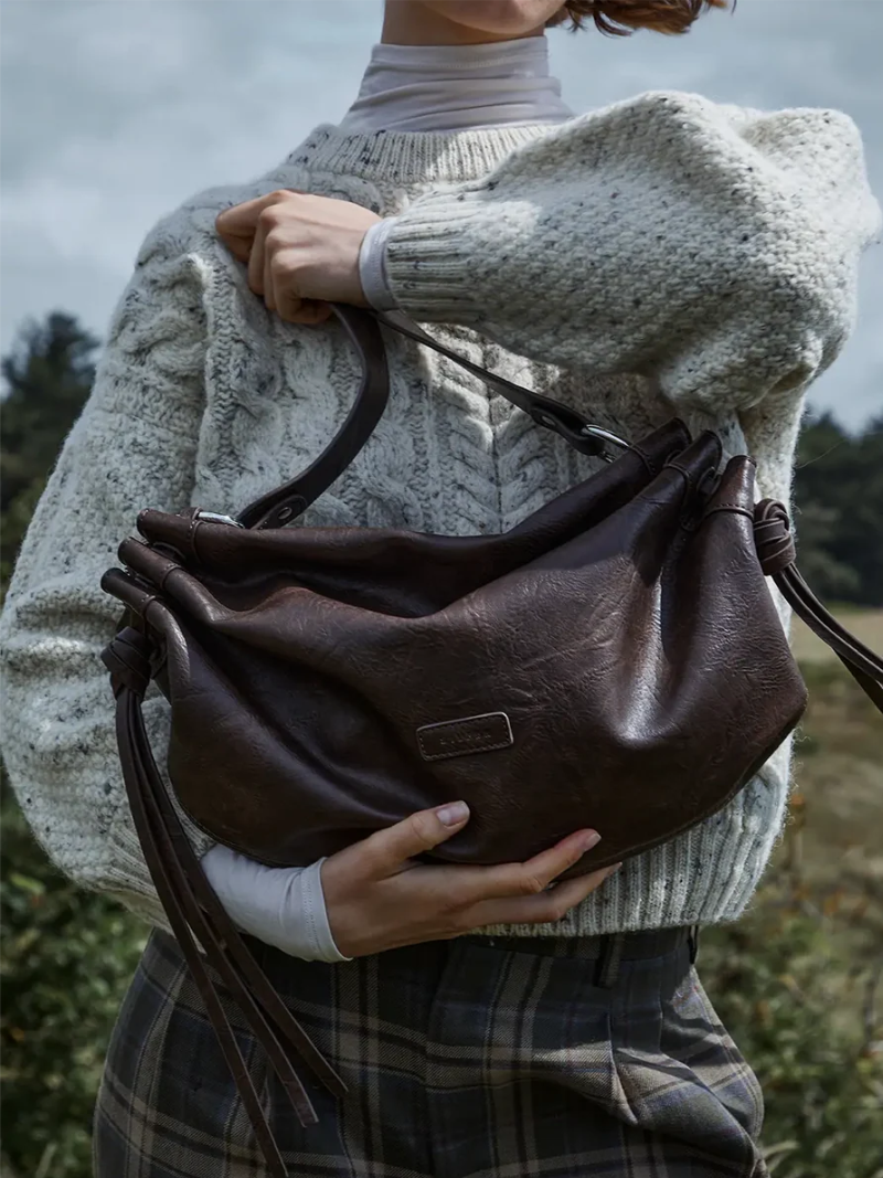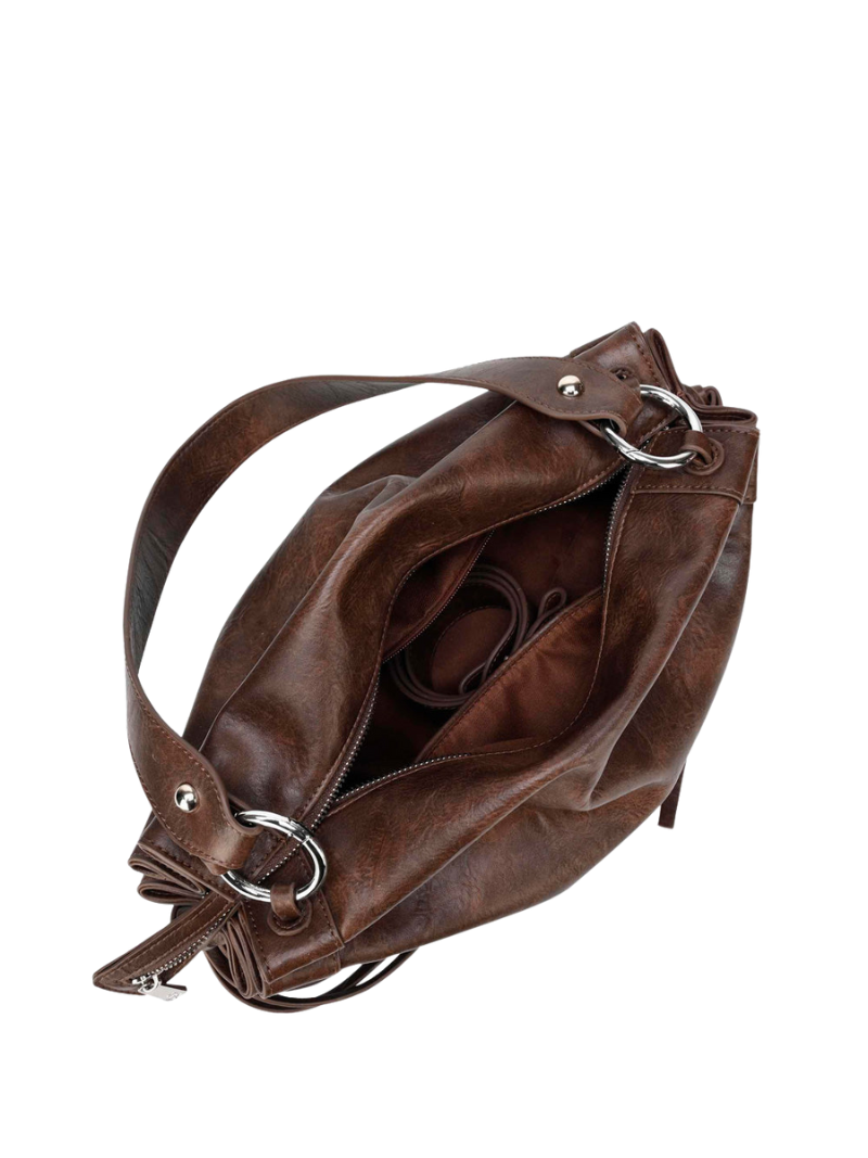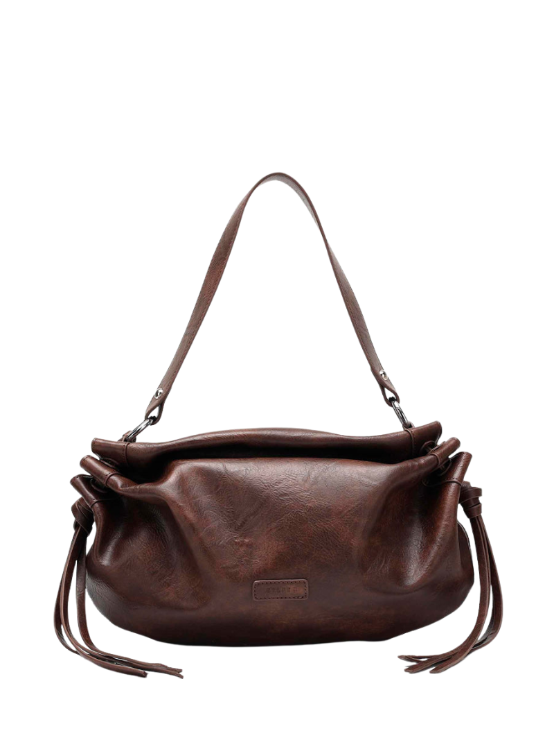 Bolso mediano en un elegante tono marrón chocolate con acabado suave y textura natural. Su silueta fluida y diseño plisado en los laterales le aportan un toque moderno sin perder su elegancia.