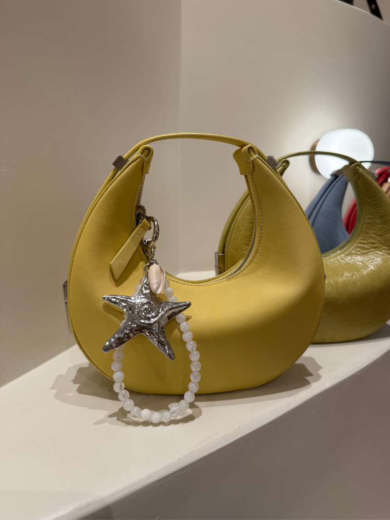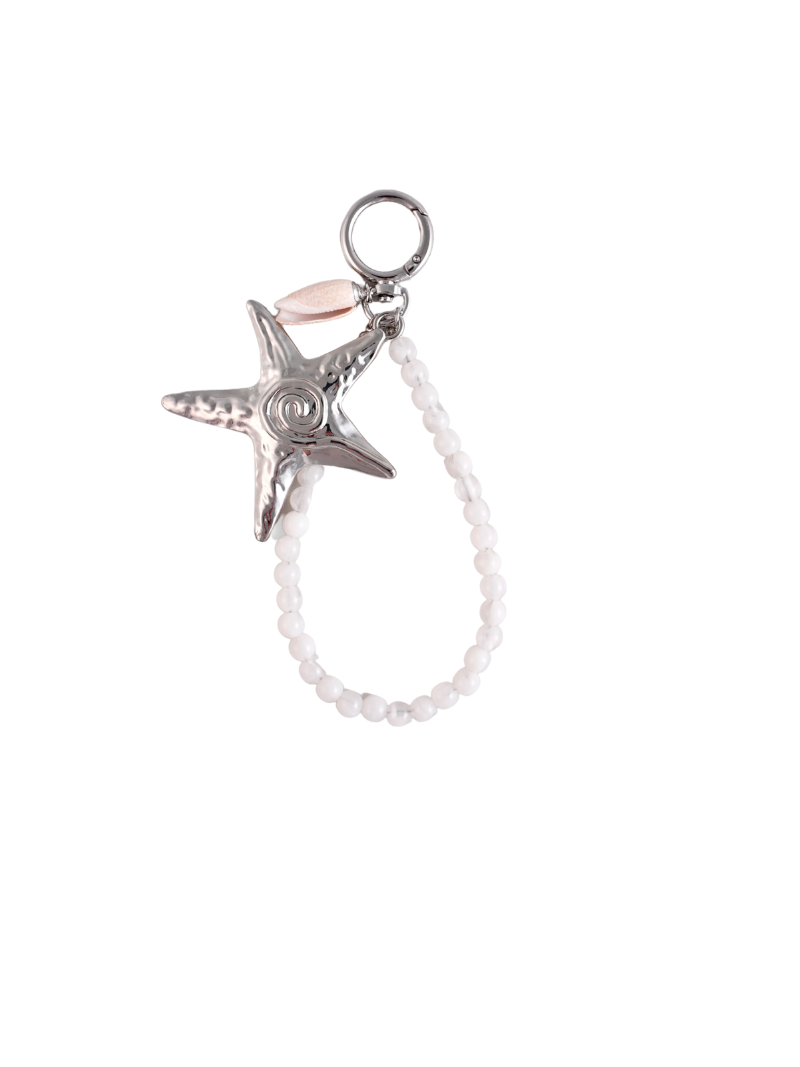 El Isla Mini es un charm con base metálica y tira de cuentas blancas, que incluye una estrella de mar plateada y una pequeña concha en tonos rosados. Su diseño combina acabados perlados y metálicos con un look limpio y veraniego.
