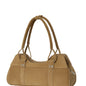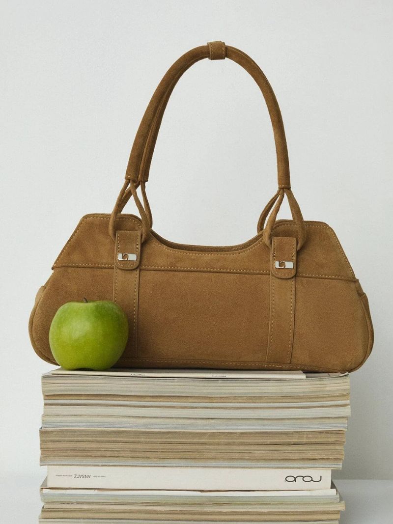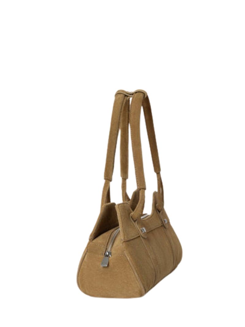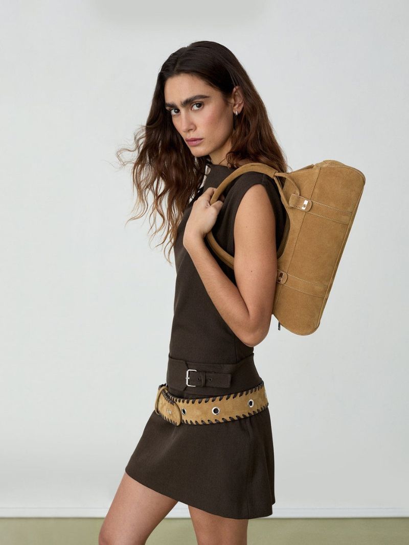 Bolso de hombro en ante camel de acabado suave y aterciopelado, diseñado para adaptarse cómodamente al cuerpo y acompañarte en tu día a día con estilo.