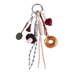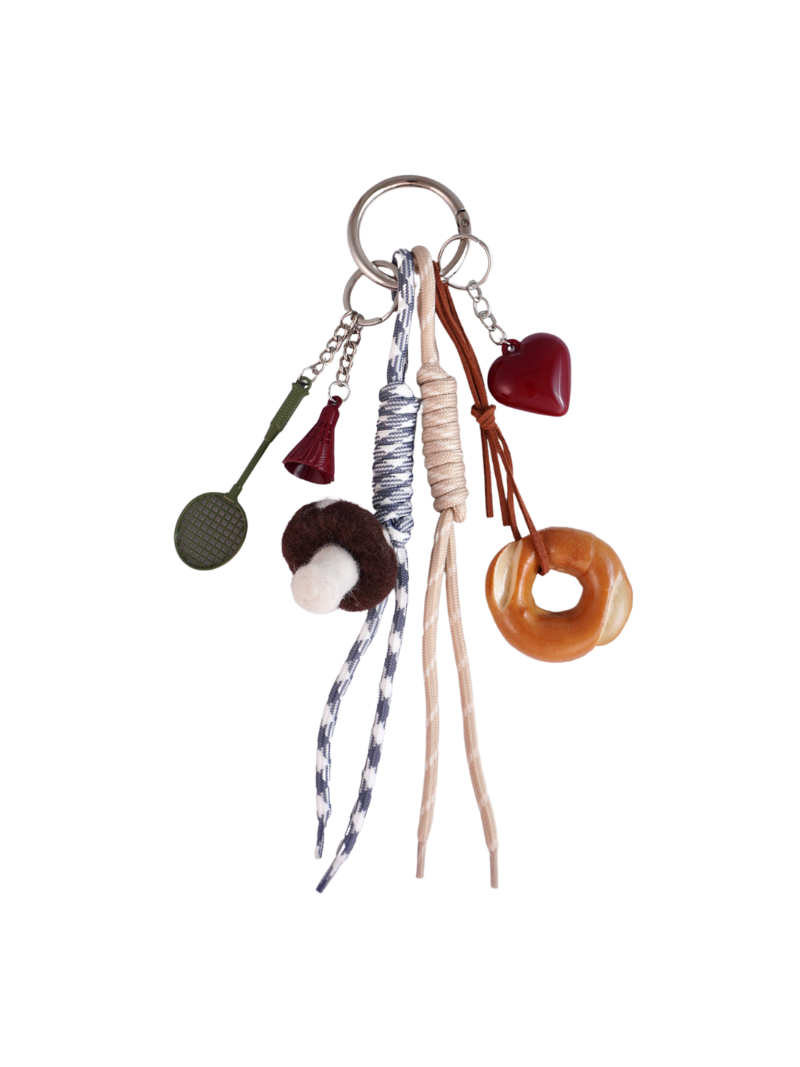 Inspirado en objetos cotidianos con un giro artístico, este charm combina elementos como una raqueta de bádminton acompañada de su pluma, un bagel, una seta de fieltro y un corazón rojo junto a diferentes cordones de color azul y crema. Su estética relajada aporta un toque creativo y lleno de estilo.