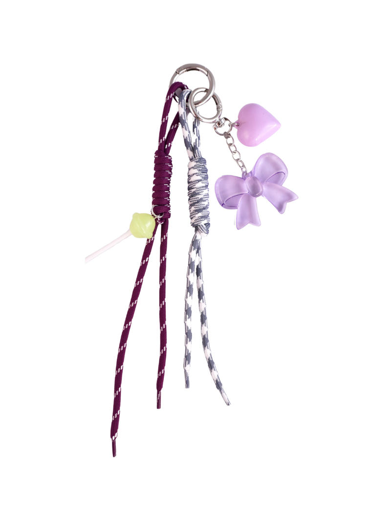 El Kira Charm de Ferent Bags es puro azúcar visual, con un lazo lila translúcido, un corazón a juego, una mini piruleta en tono lima y cordones trenzados en burdeos y blanco con gris, este charm mezcla lo dulce con lo atrevido.